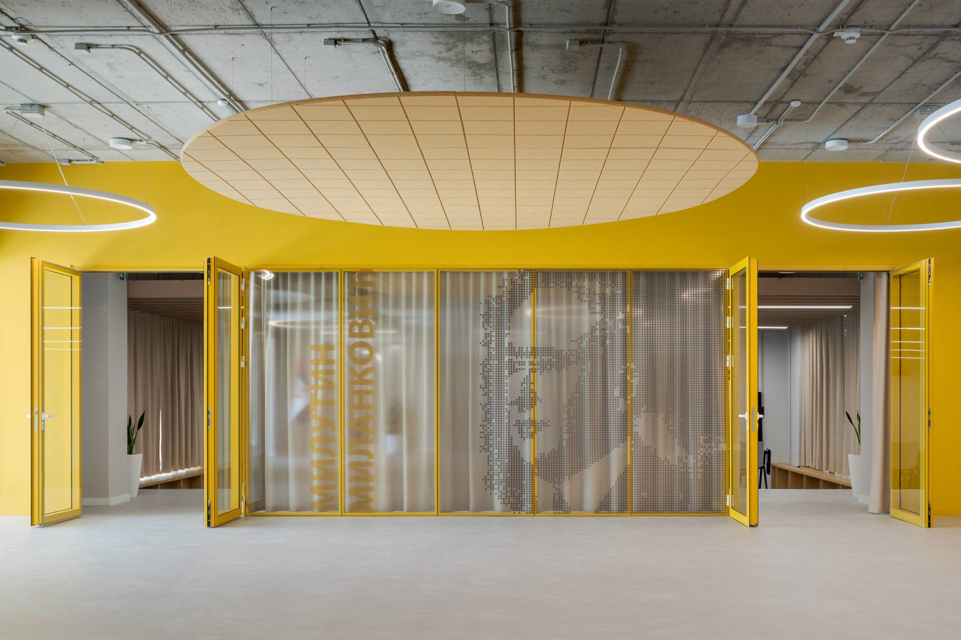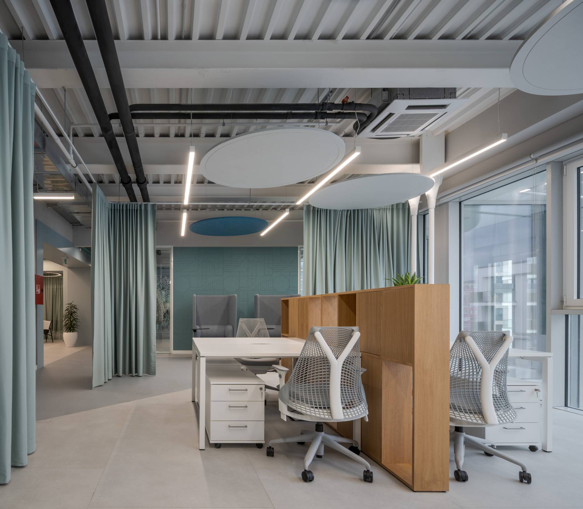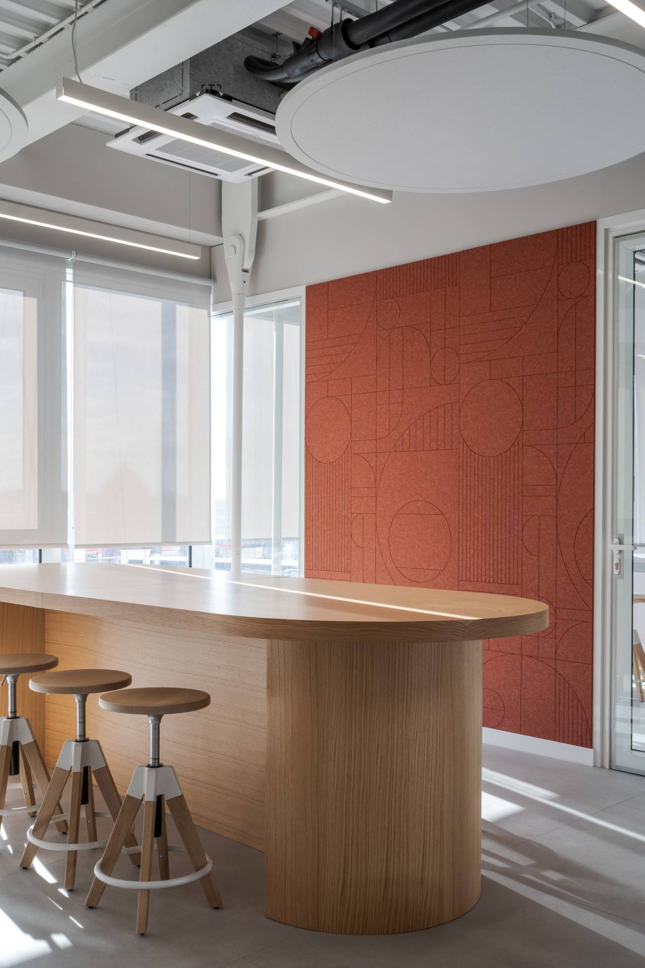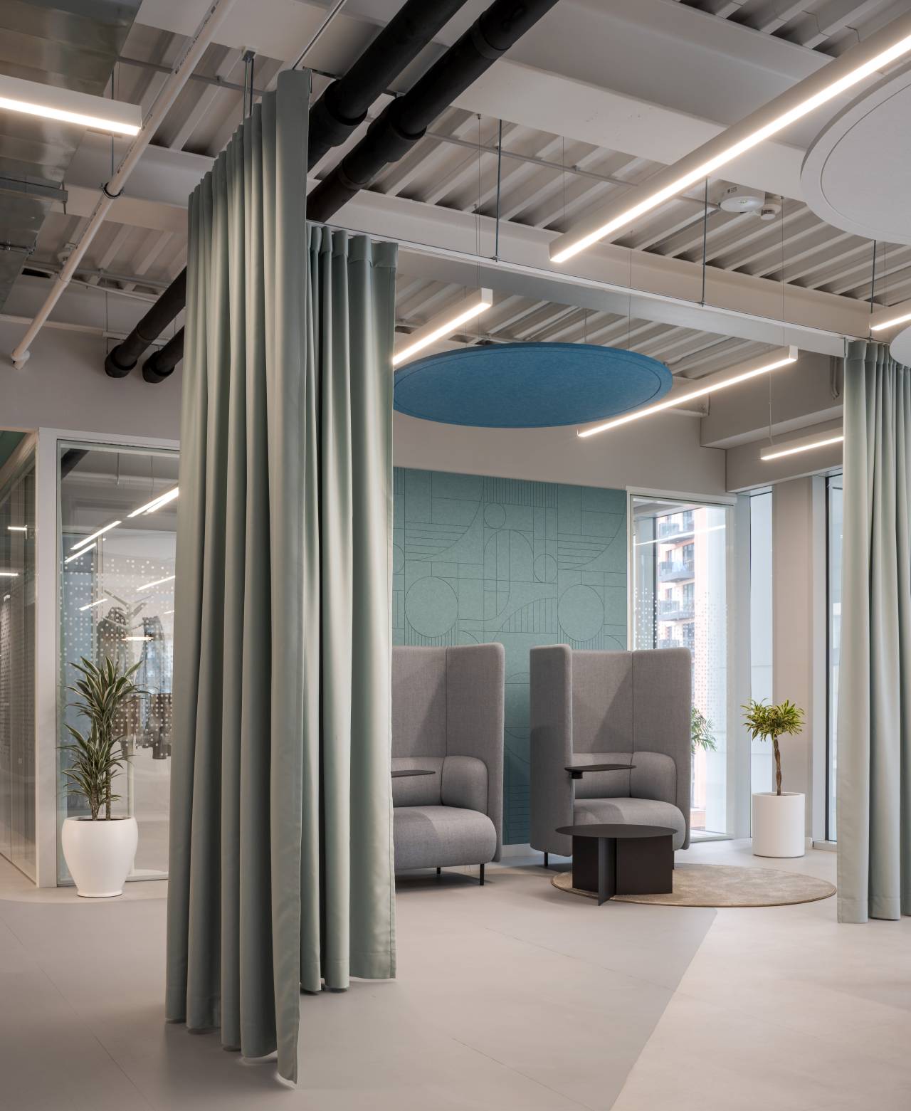 Iako je osnovna struktura prostora geometrijski jasna i racionalna, dodatna mekoća postignuta je kroz tekstilne elemente i akustične materijale.