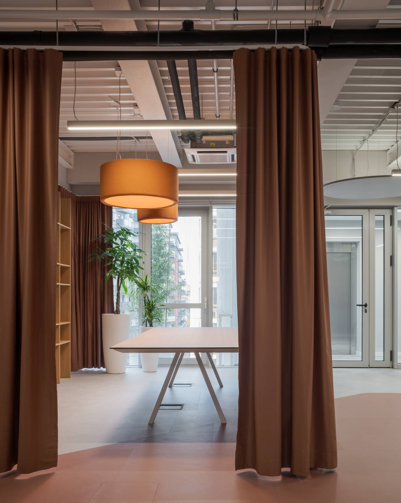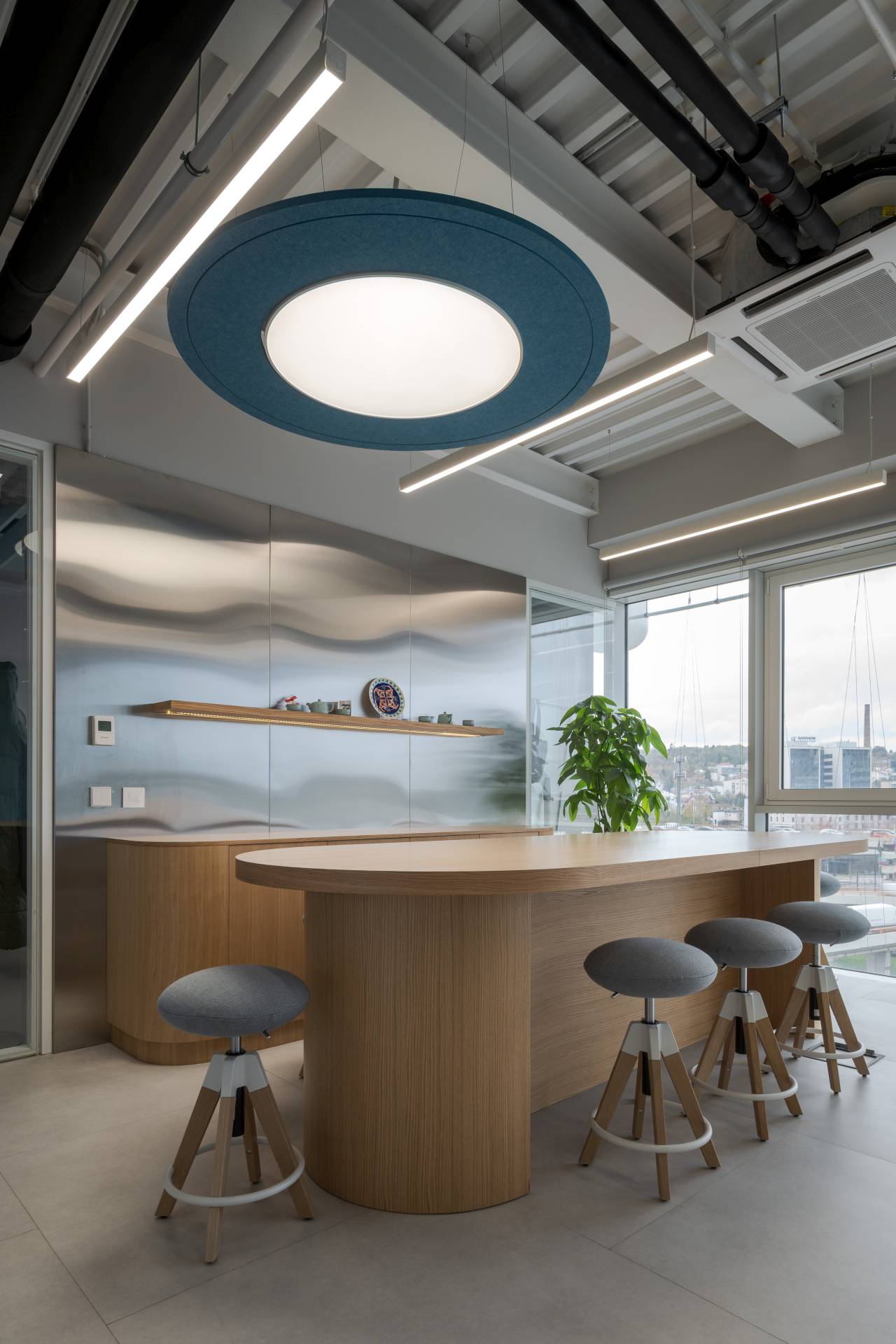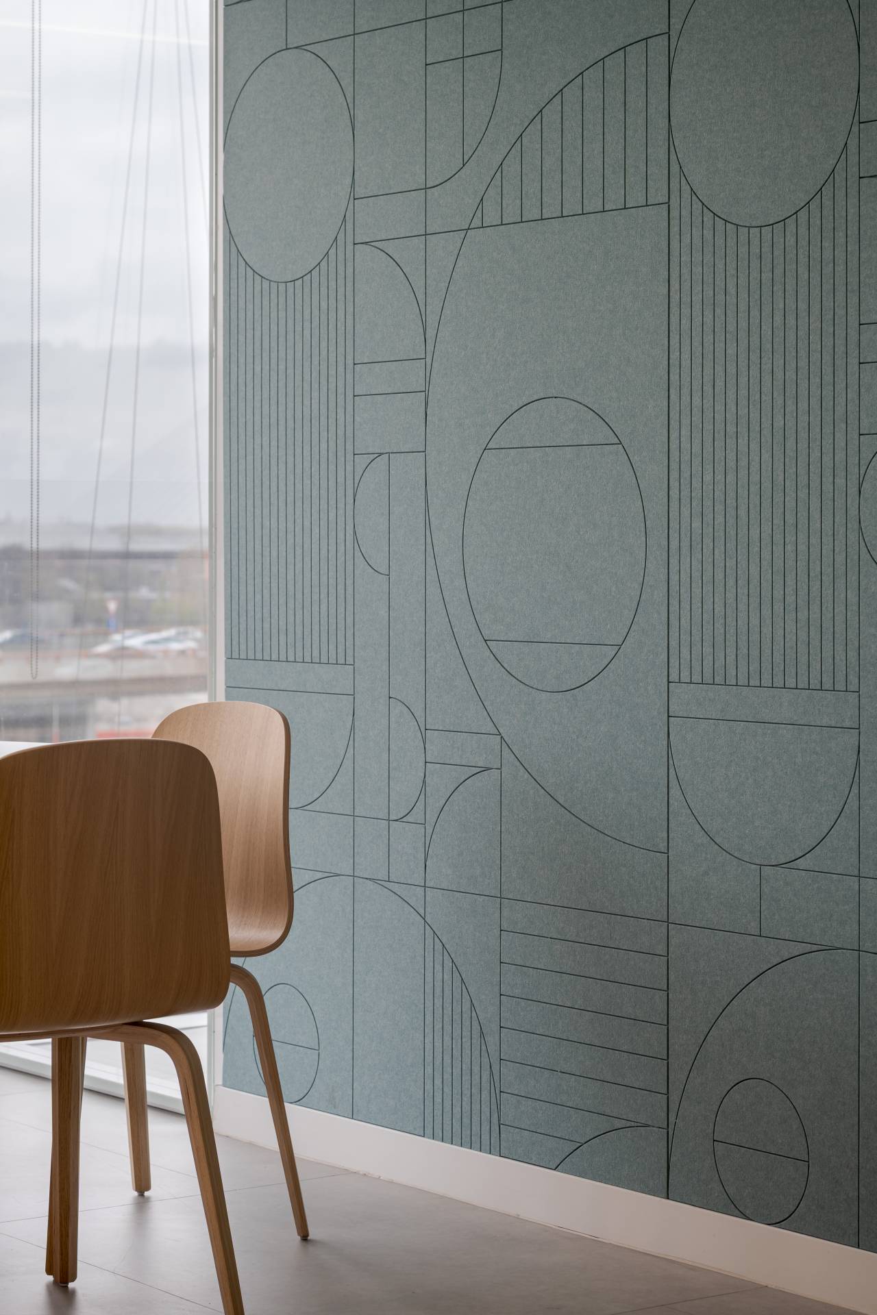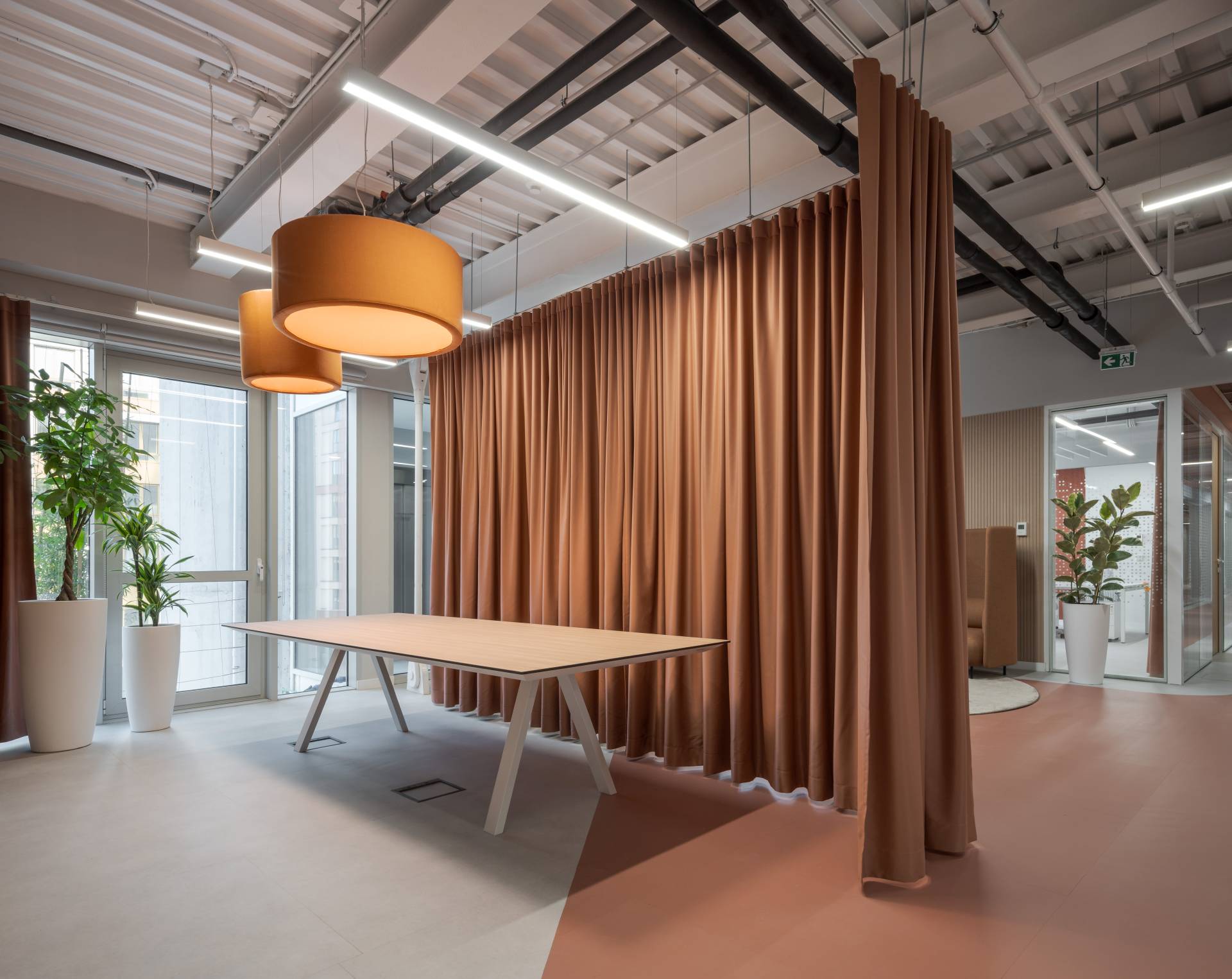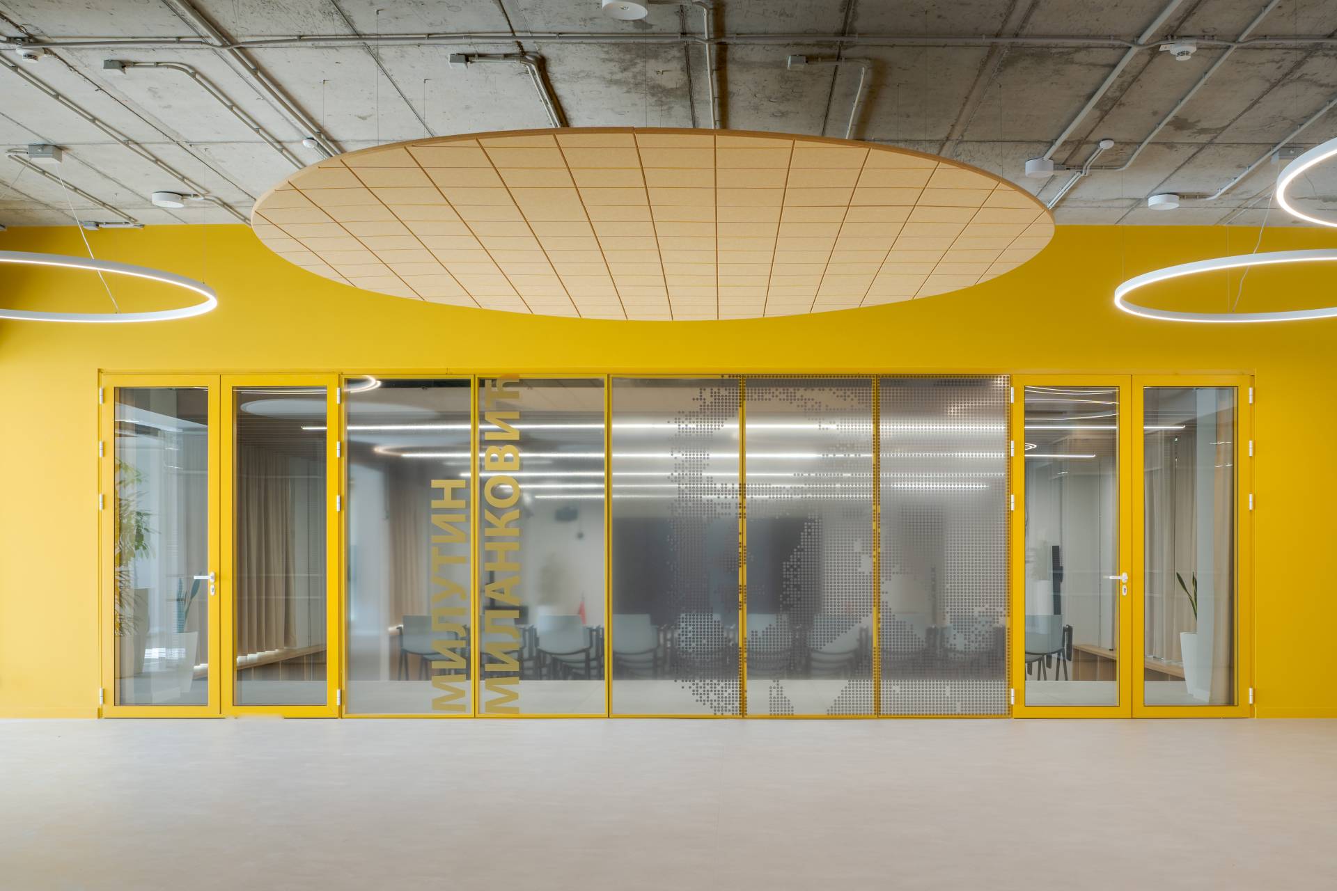 Iako je osnovna struktura prostora geometrijski jasna i racionalna, dodatna mekoća postignuta je kroz tekstilne elemente i akustične materijale.