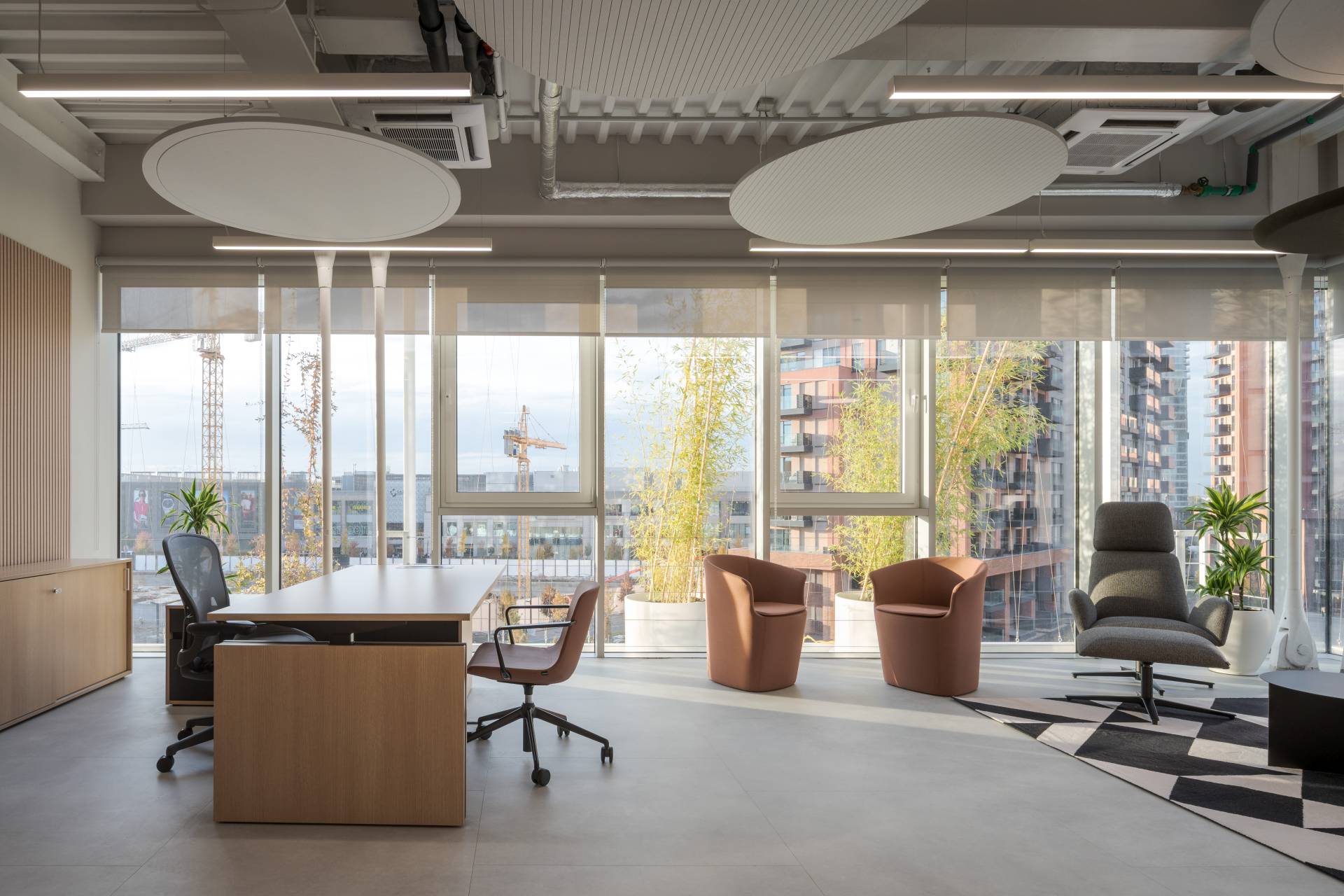 Zbog prisustva tvrdih materijala poput betona, stakla i aluminijuma, akustika je dodatno tretirana. Pored nameštaja i tekstila, uvedene su i profesionalne akustične obloge, posebno u zonama plafona i pregradnih zidova.