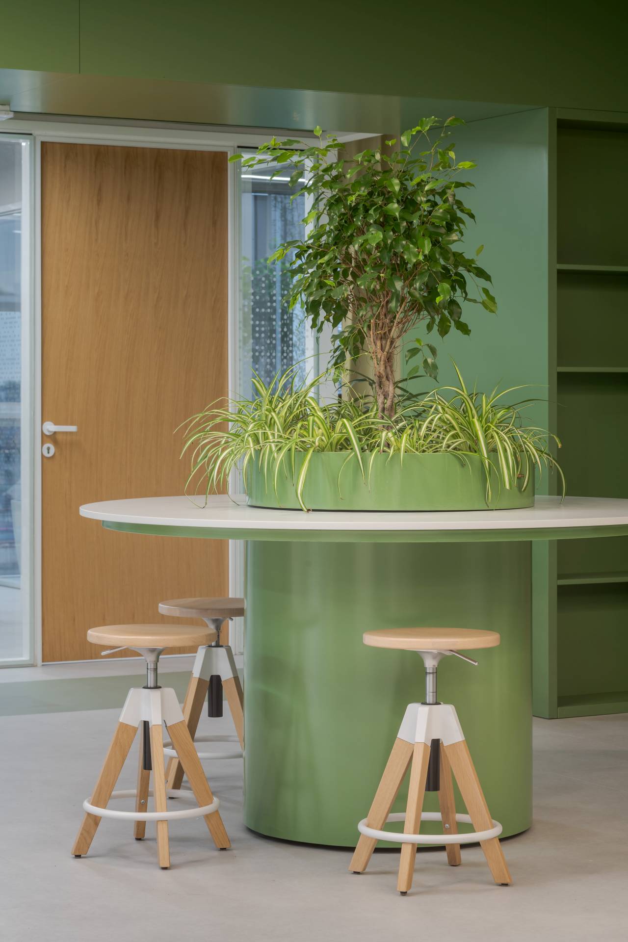 Ozelenjena fasada se nastavlja u enterijer, gde se zelenila pojavljuju kao “ostrva” unutar prostora. Transparentni završeci zidova dodatno doprinose osećaju širine i osvetljenosti, dok se granice između zona vizuelno ublažavaju.