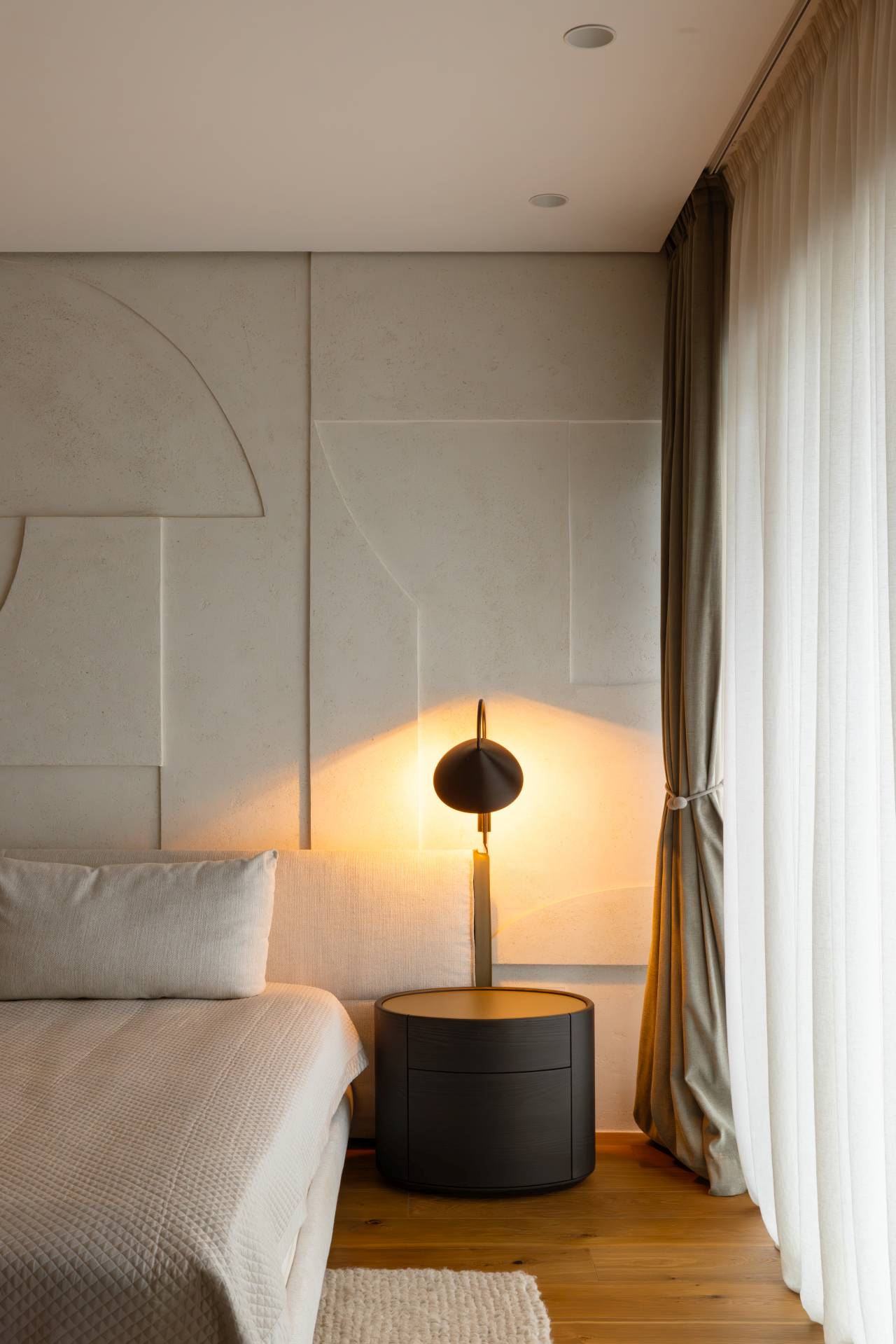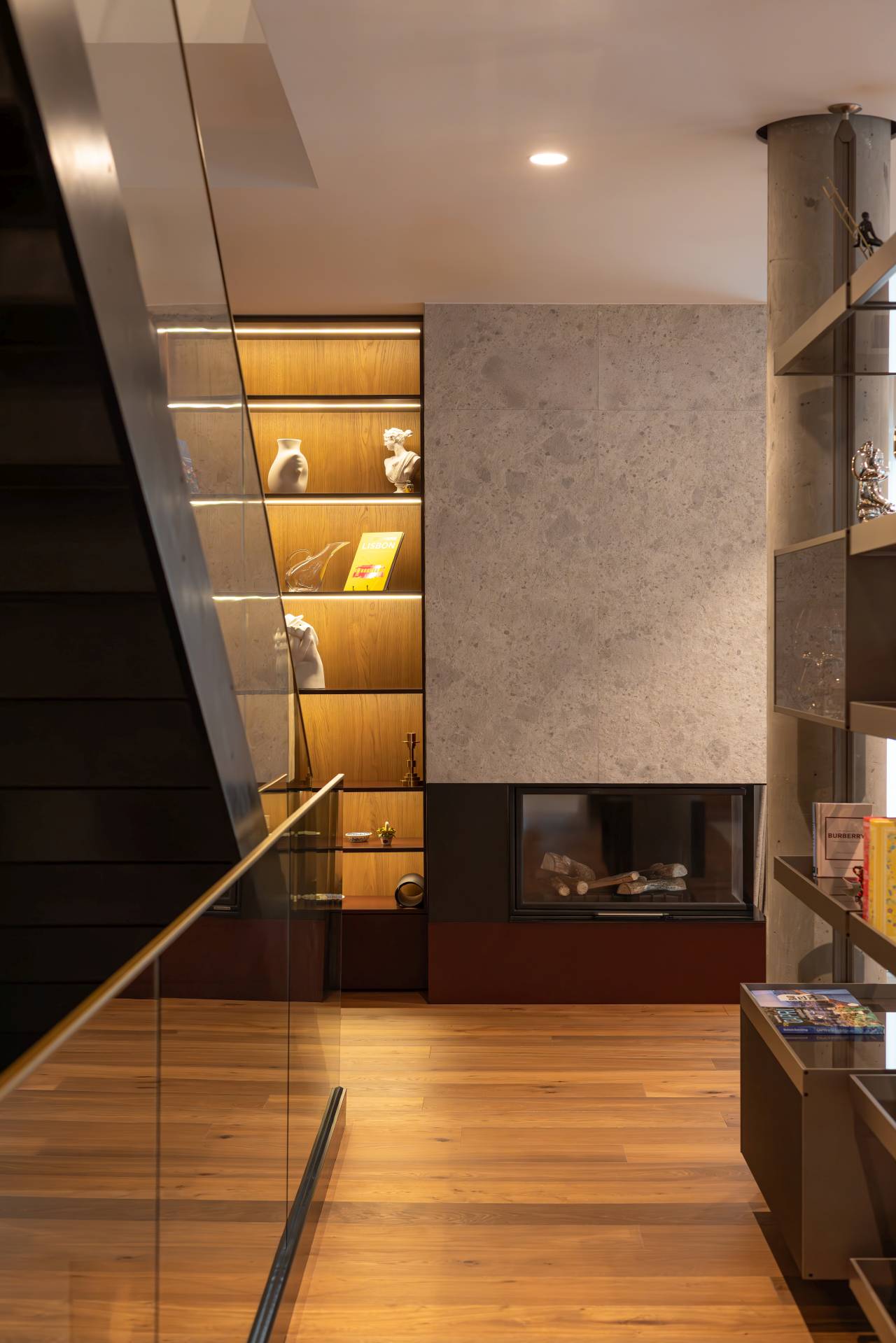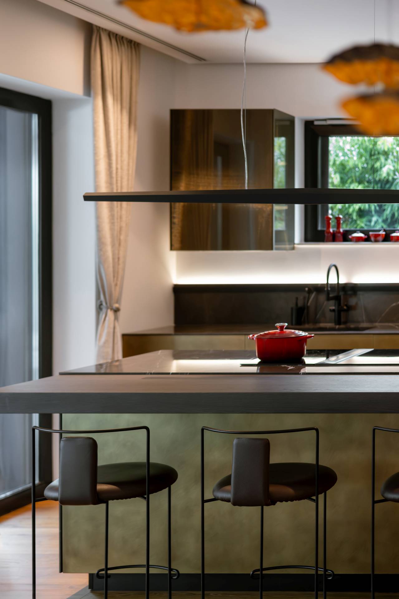 Osvetljenje je projektovano slojevito, sa naglaskom na ambijentalnu rasvetu koja gradi atmosferu i naglašava materijale i volumene. Integrisane LED linije u ugradnim elementima dodatno ističu kontraste i doprinose sofisticiranom karakteru prostora.
