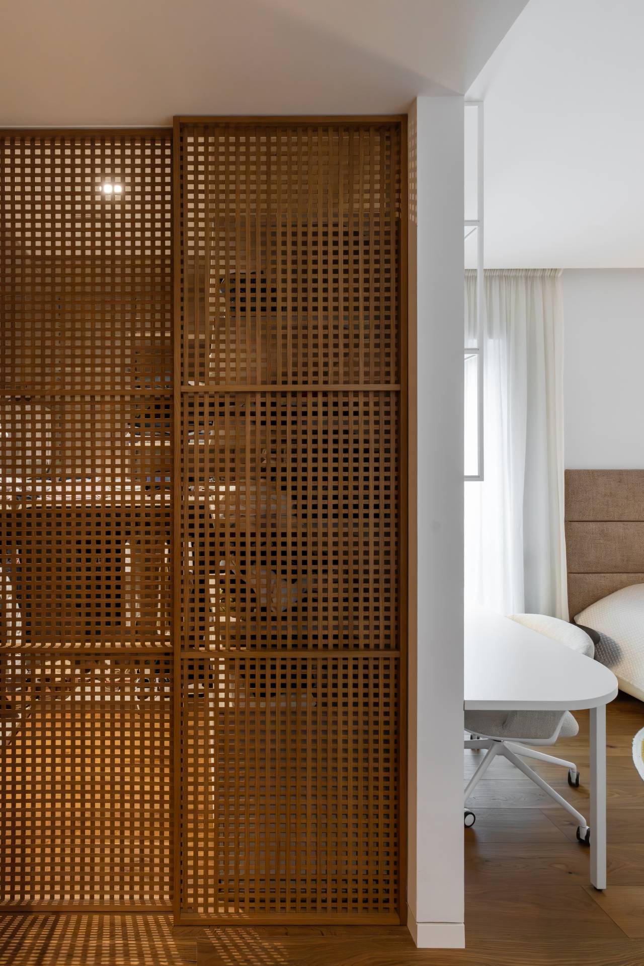 „Estetika nikada nije bila sama sebi cilj, već je uvek pratila funkcionalne zahteve„, naglašavaju autori. Ugradni nameštaj rađen je po meri kako bi se prostor maksimalno iskoristio, dok je pokretni nameštaj biran prema kriterijumima ergonomije, udobnosti i vizuelne lakoće.