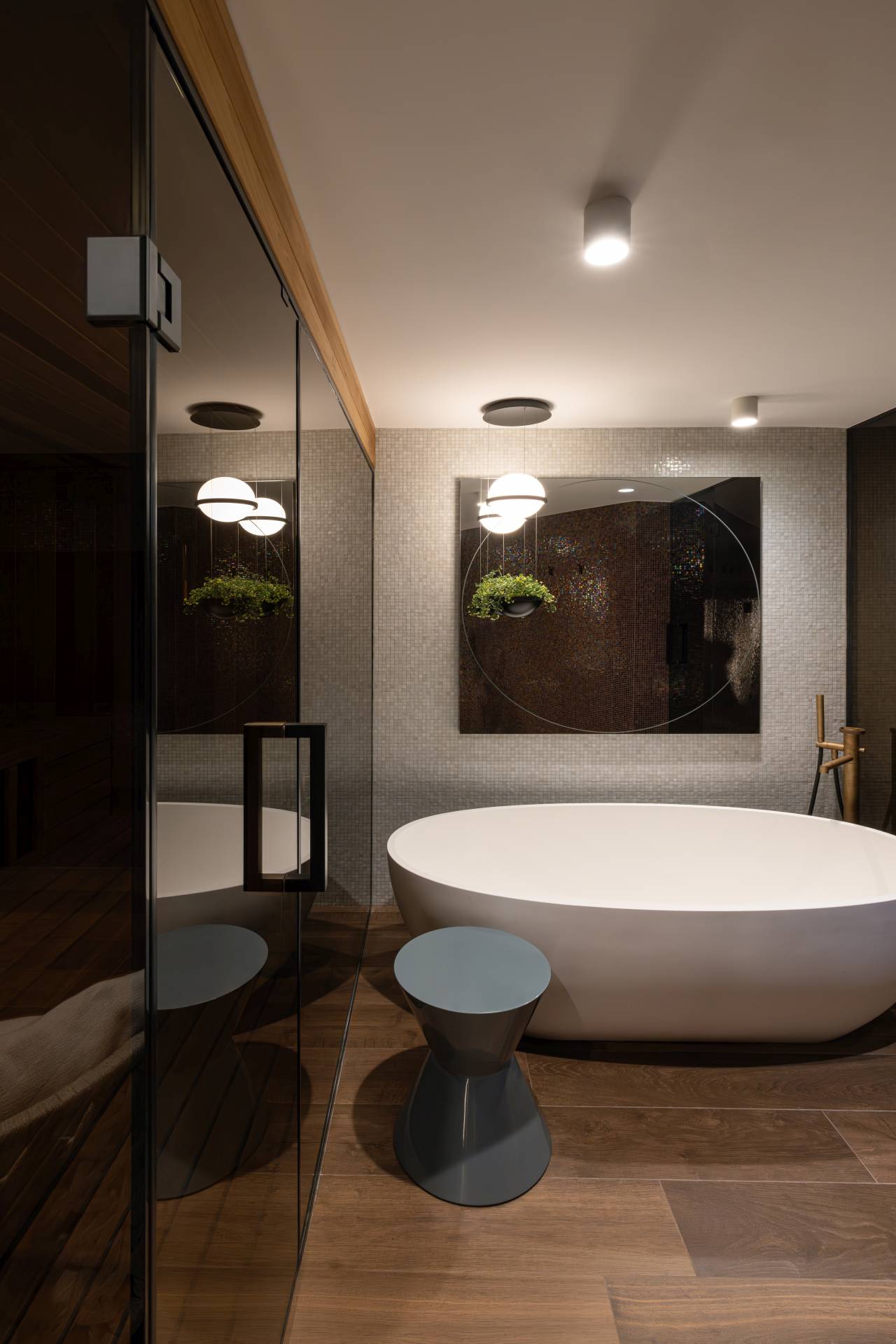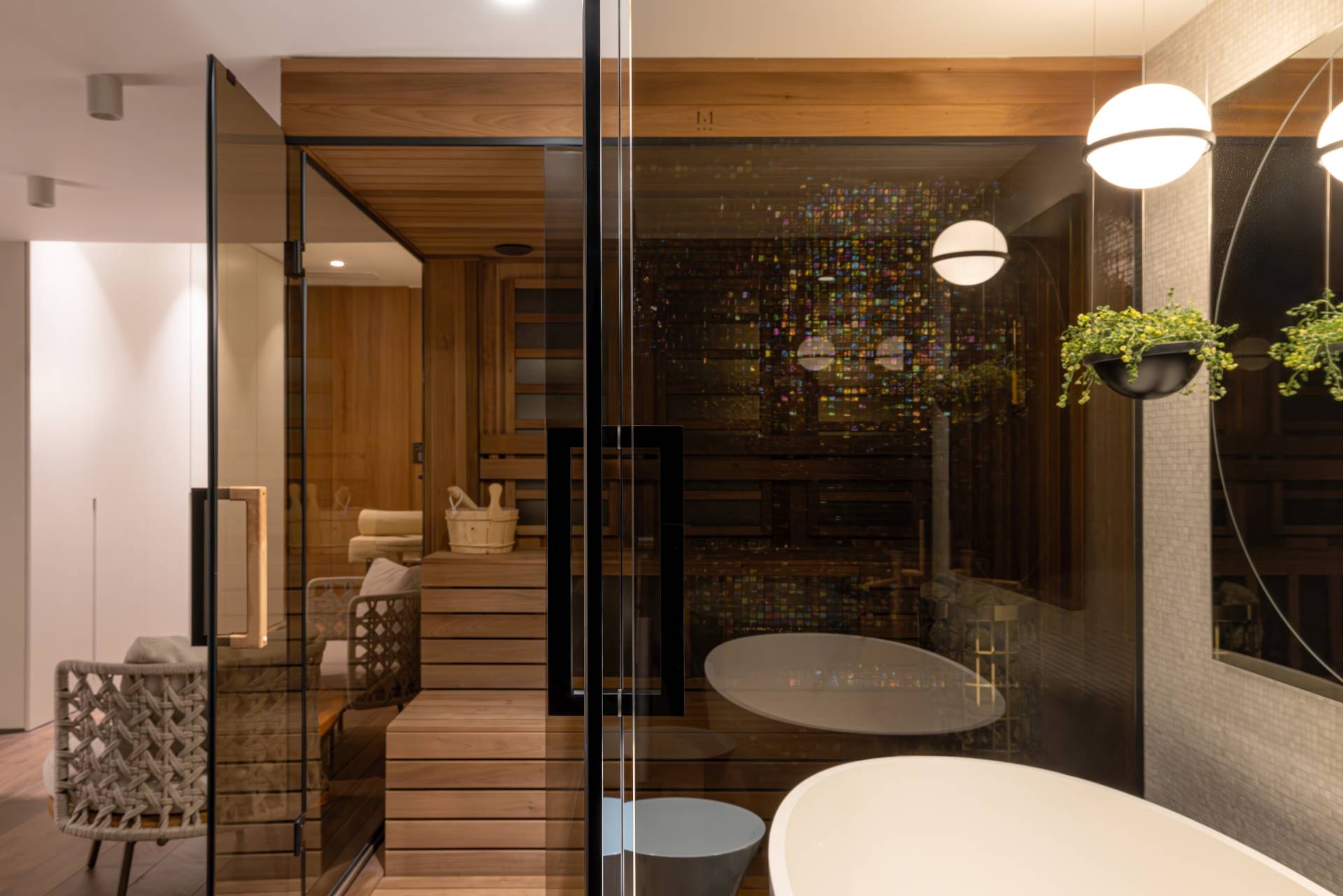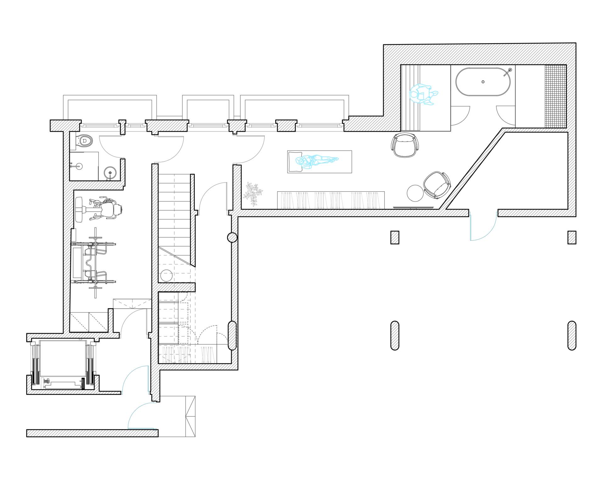 Posebno zahtevan segment projekta bila je prenamena podruma u „wellness“ zonu, koja je podrazumevala kompleksna tehnička rešenja u pogledu ventilacije, hidroizolacije, akustike i osvetljenja, bez odricanja od estetskog kvaliteta.
