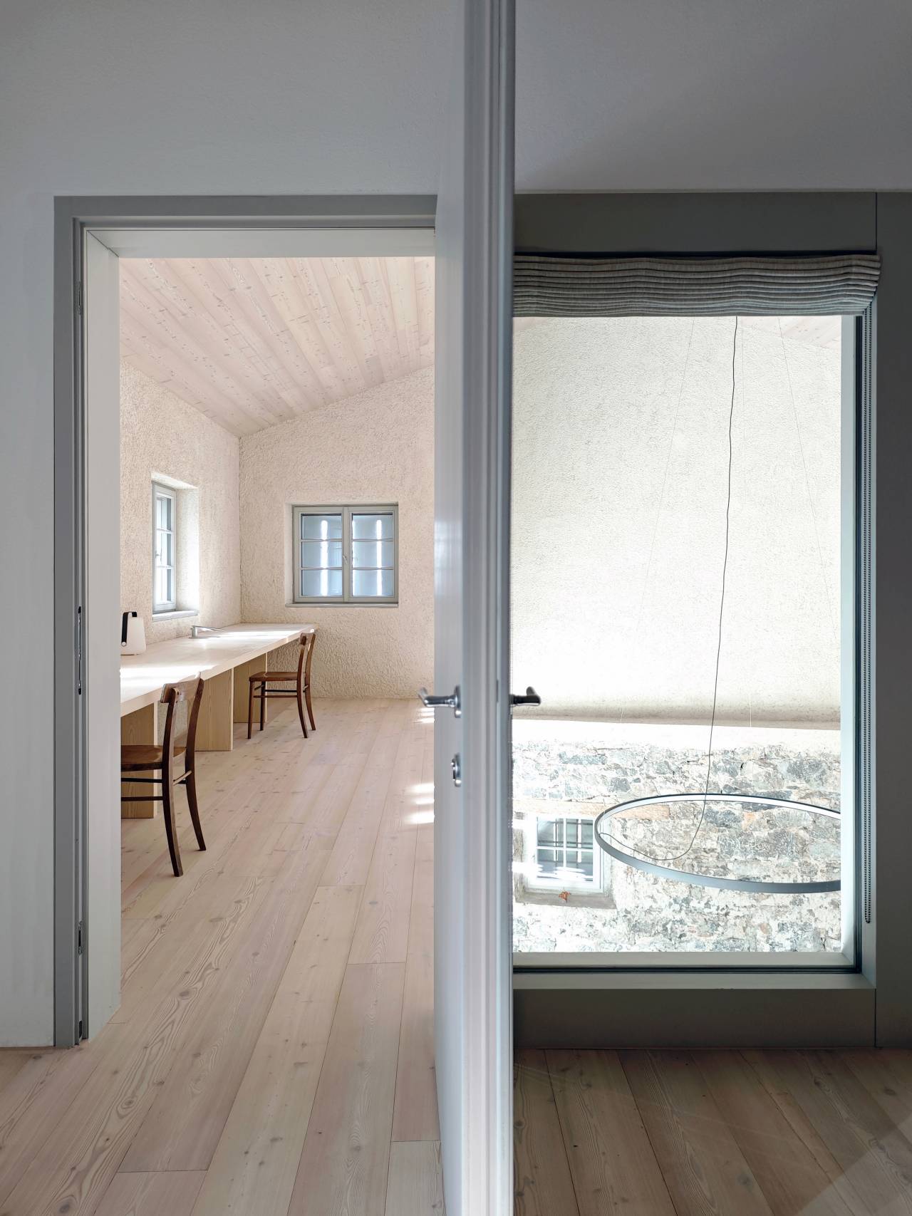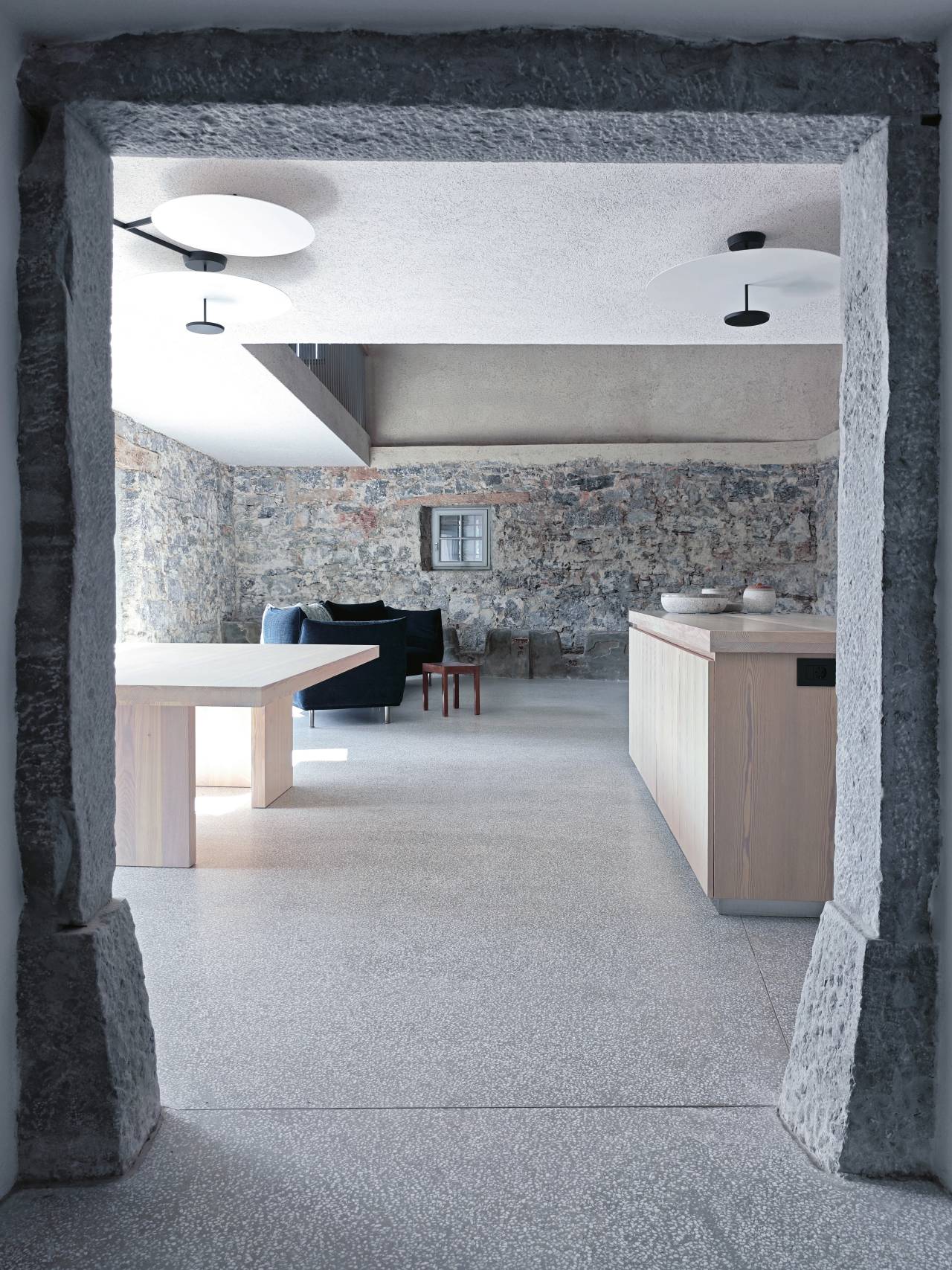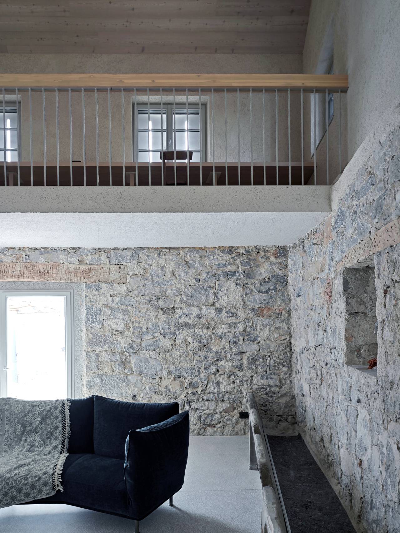 Unutrašnji prostori kuće zadržavaju izraženu materijalnost originalne strukture. Kameni zidovi ostavljeni su vidljivim, bez pokušaja da se prikriju tragovi vremena.