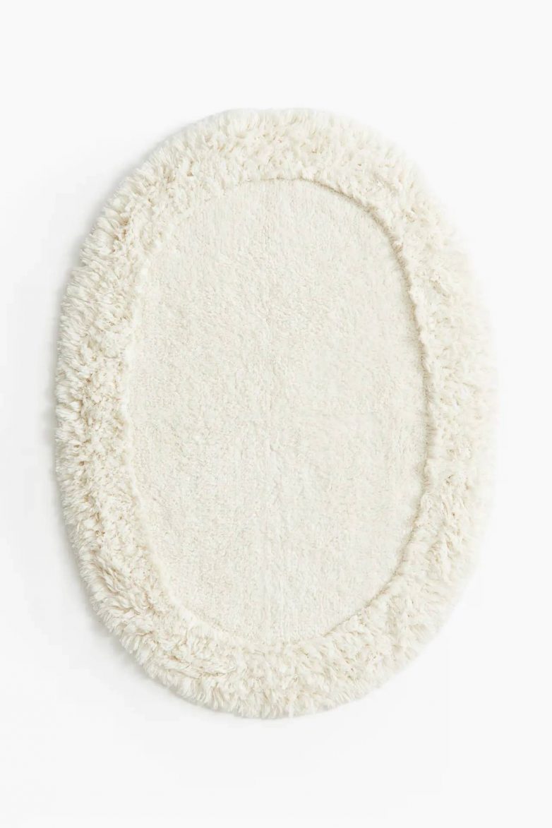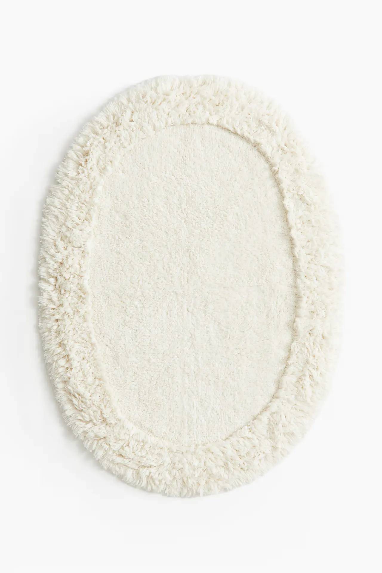 Ovalna prostirka za kupatilo od izdržljive pamučne tkanine sa taftovanom gornjom stranom koja je meka i prijatna pod nogama.