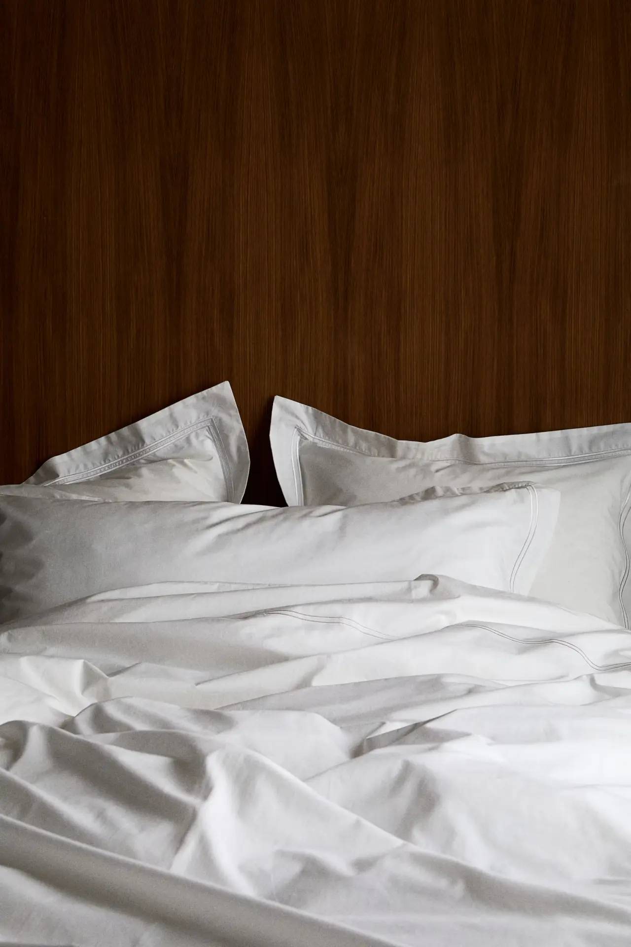 Posteljina za bračni krevet od gusto tkanog pamučnog perkala sa vezom i 300 finih niti. Navlaka za jorgan kopča se dugmićima u dnu, a dve jastučnice imaju otvor na preklop.
