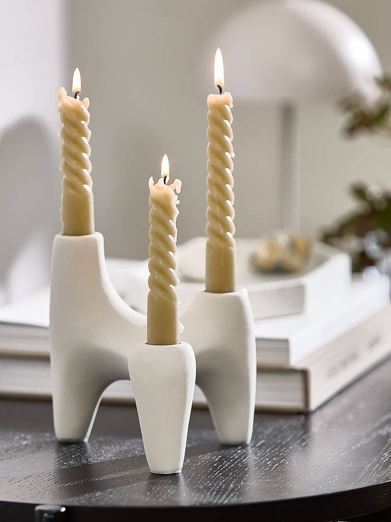 Svećnjak skulpturalnog i modernog dizajna čiji meki, zakrivljeni oblik drži tri sveće na različitim visinama, stvarajući dinamičan i umetnički izraz.