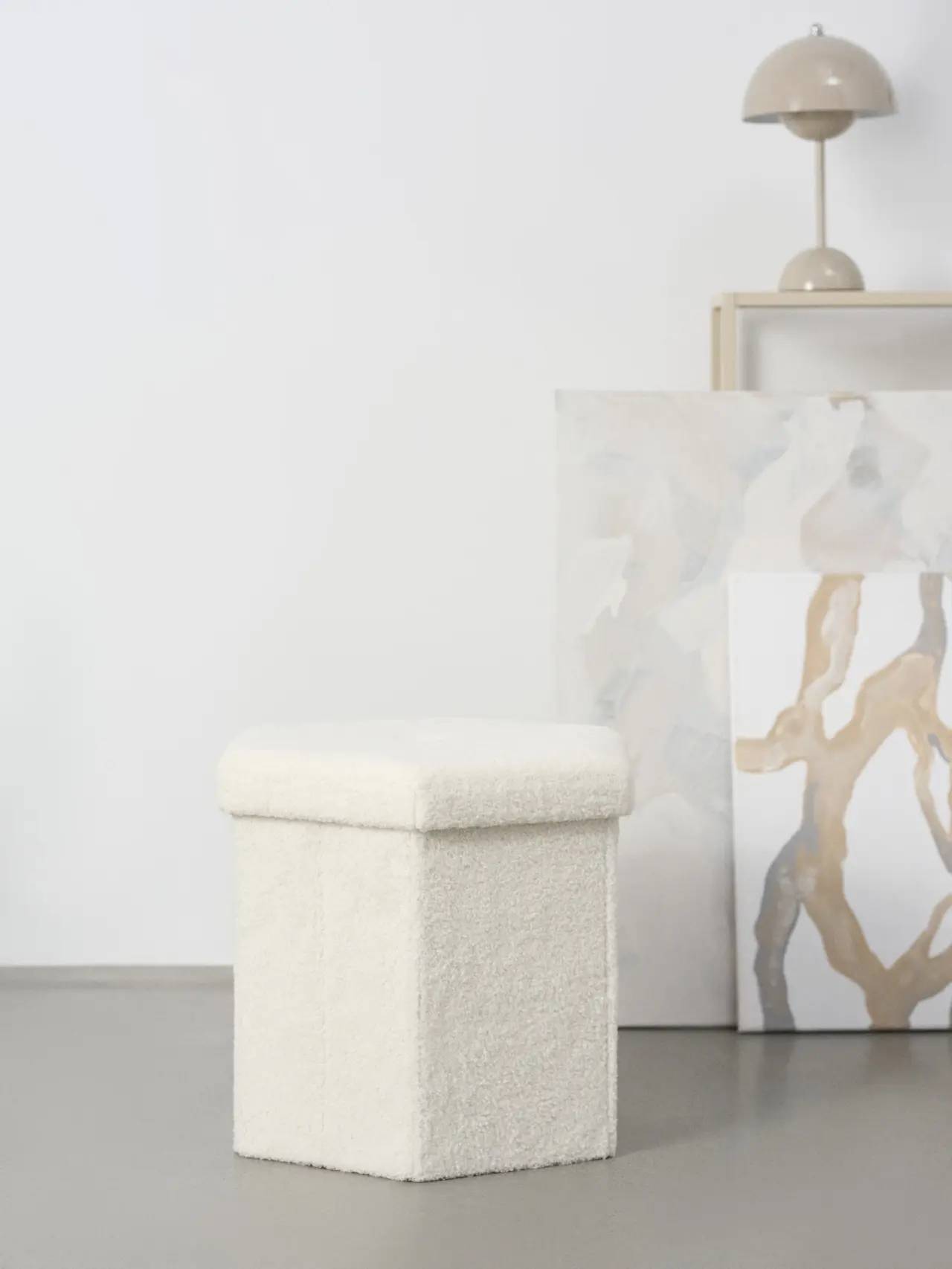Tabure sa poklopcem može da posluži za skladištenje ćebeta, knjiga ili časopisa. Izrađen od bukle tkanine, može da bude dodatak dečijoj sobi, hodniku ili spavaćoj sobi.