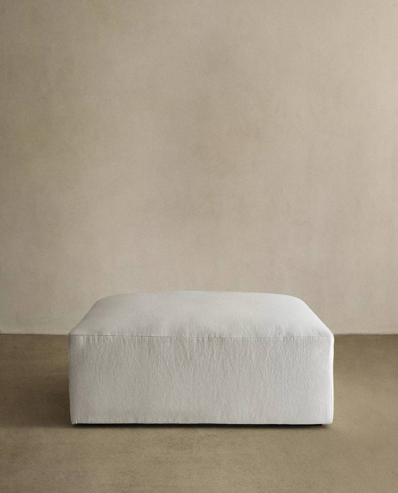 Tabure presvučen u tkaninu ispranog lana, napravljen sa unutrašnjim drvenim okvirom obloženim penom i nogama od bukovine.