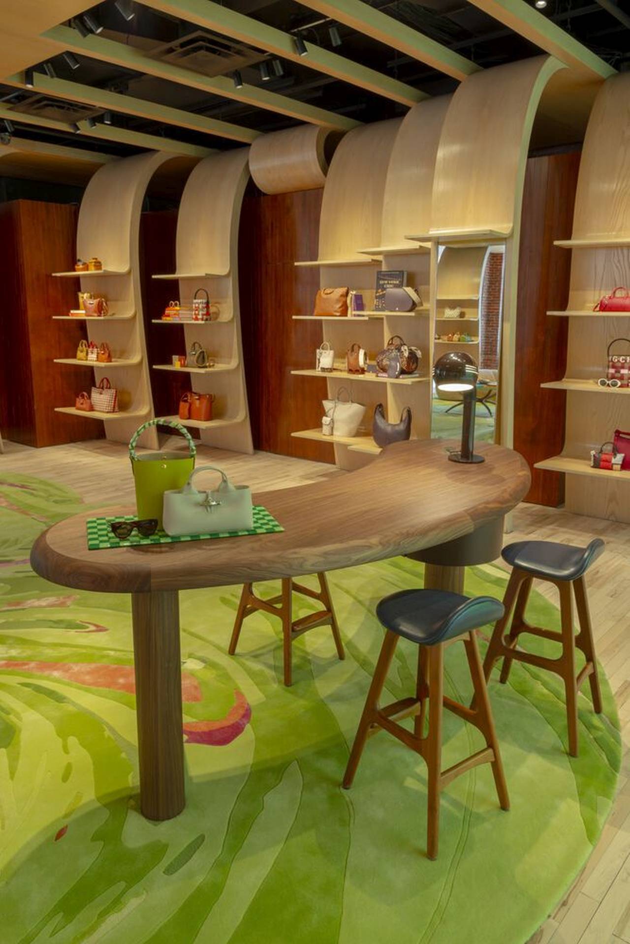 Ova funkcionalna skulptura vodi posetioce na laganu „šetnju“ kroz prostor, postavljajući ton za doživljaj koji više podseća na prijatan stan nego na luksuznu prodavnicu.