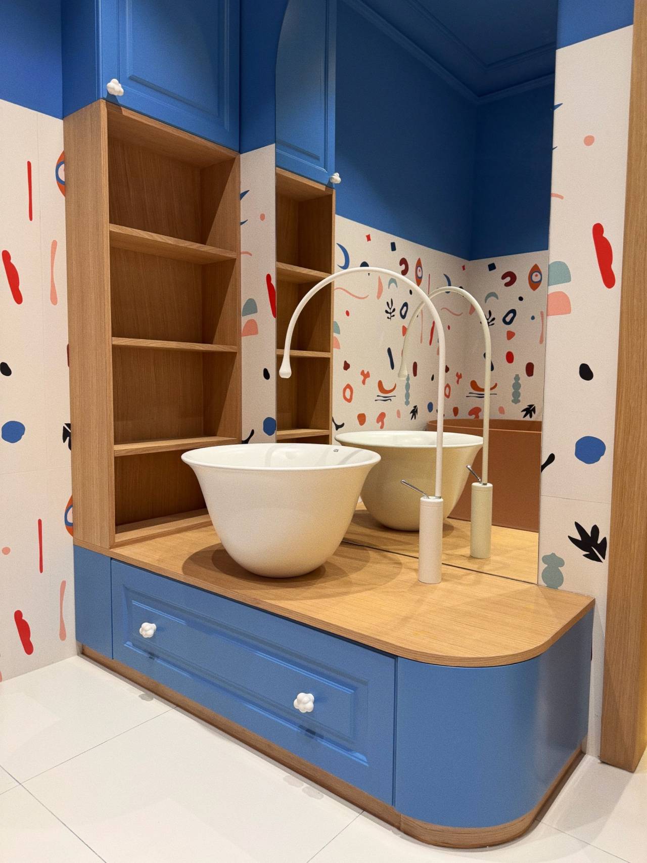 Model Zoe sa apstraktnim, šarenim motivima uveden je kao glavni vizuelni sloj kupatila i upravo on daje prostoru karakter koji se pamti. Nasuprot tome, u tuš-kabini korišćene su male bele pločice Biscuit , koje imaju sasvim drugačiju ulogu.