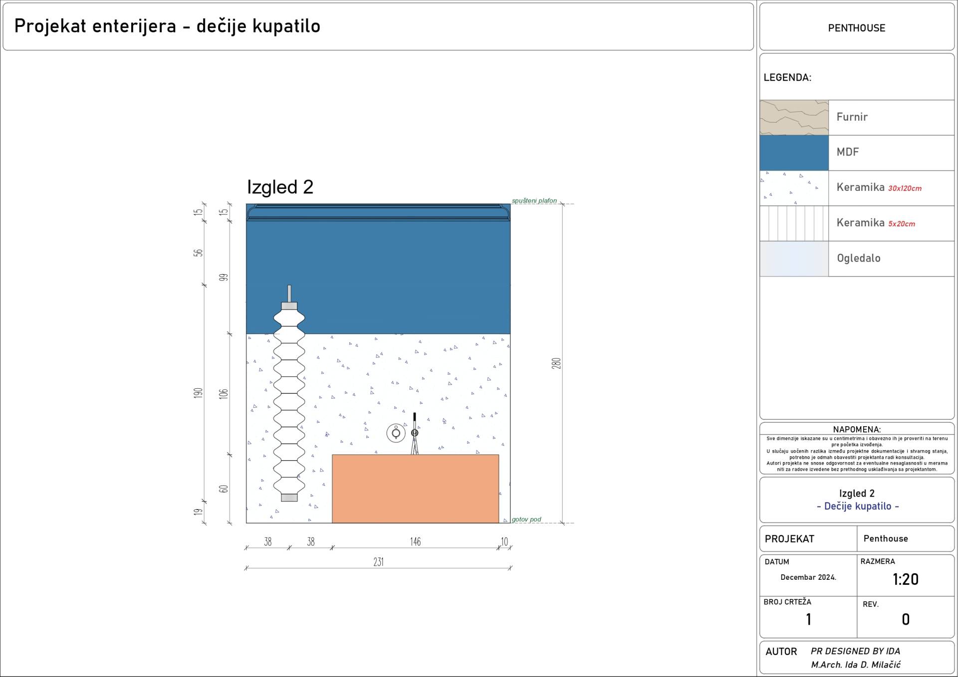 Kako sama autorka navodi, „kupatilo je srednje kvadrature, ali je tretirano kao mikro svet za dete, prostor koji istovremeno stimuliše maštu, pruža osećaj sigurnosti i zadržava visok nivo estetike i funkcionalne kontrole, u skladu sa savremenim standardima dizajna enterijera.“