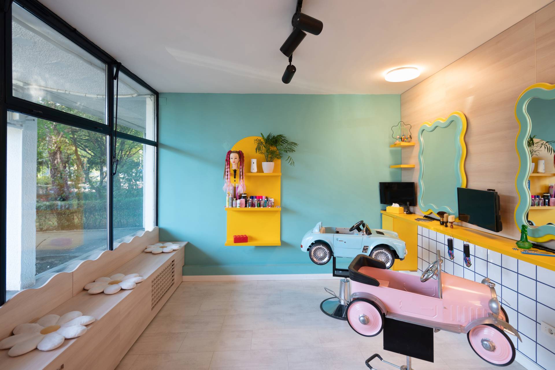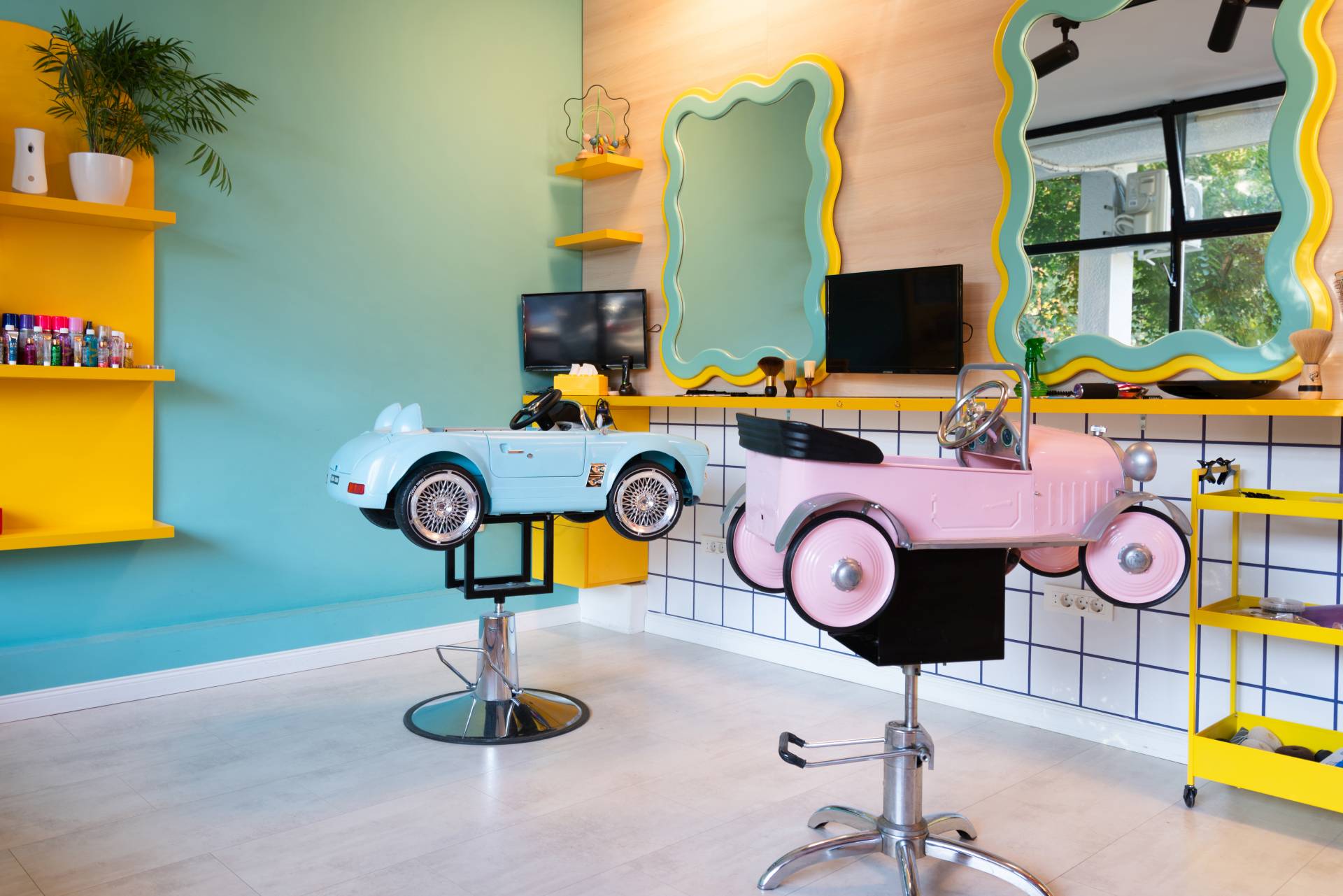 Prostor je pažljivo opremljen elementima koji imaju i funkciju i ulogu u stvaranju atmosfere. Tematske stolice u obliku automobila uvode igru u sam proces šišanja, dok je u čekaonici formiran poseban segment za igru i boravak.