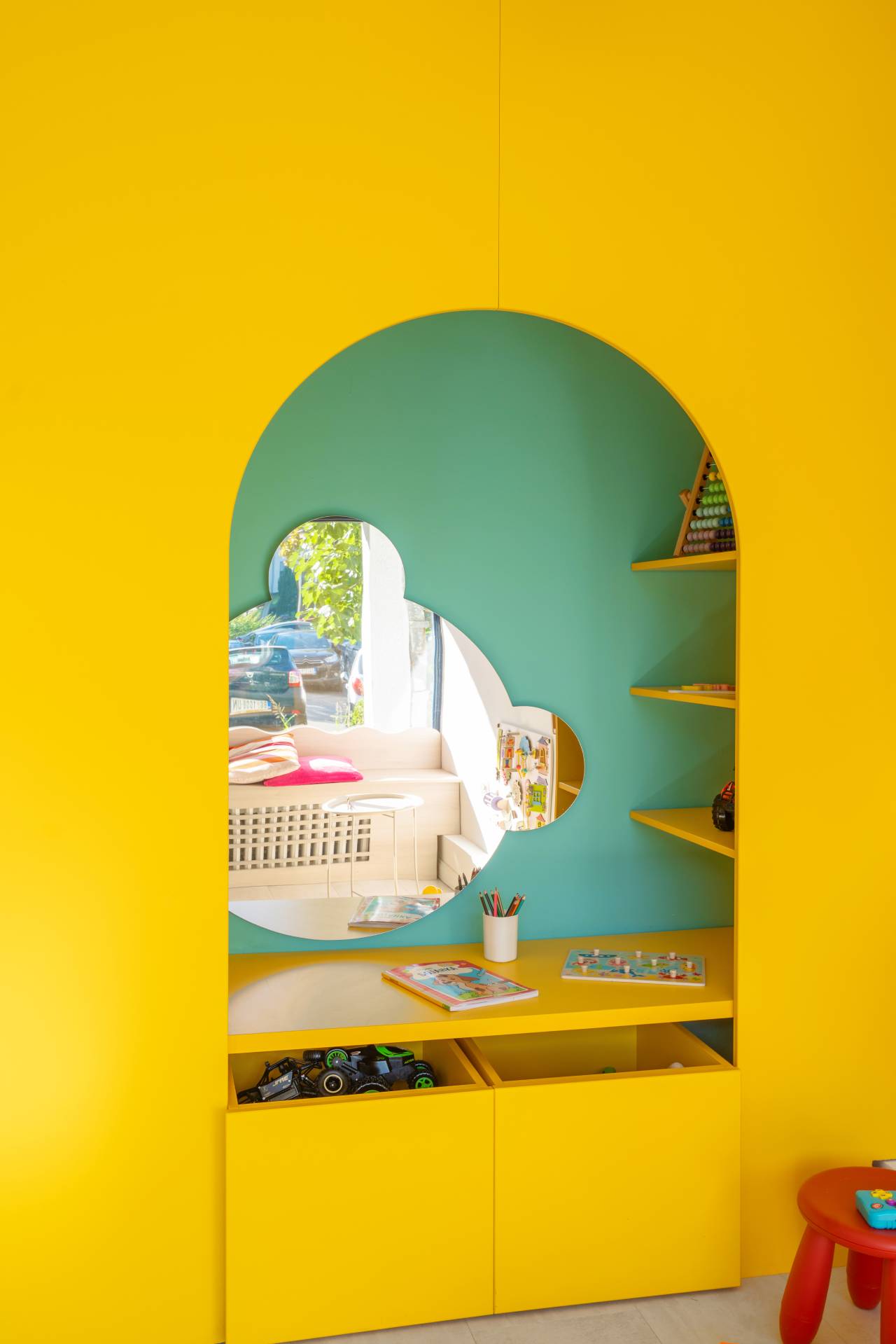 Najupadljiviji element ovog enterijera je koloristička paleta. Umesto sigurnih, neutralnih tonova, prostor je definisan kombinacijom žute, plave, roze i zelene u svom punom intenzitetu.