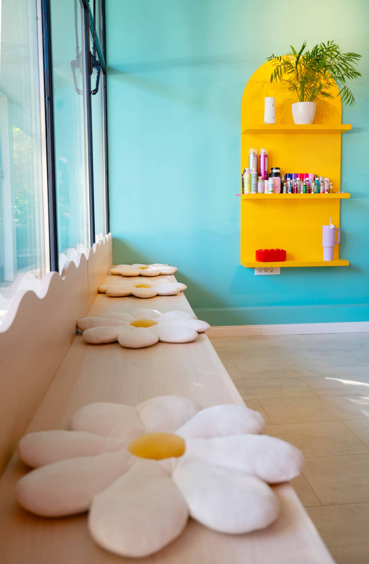 Kontinuirana klupa uz prozor, sa talasastom linijom i jastucima u obliku cvetova, povezuje prostor i uvodi toplinu kroz prirodnu teksturu drveta.