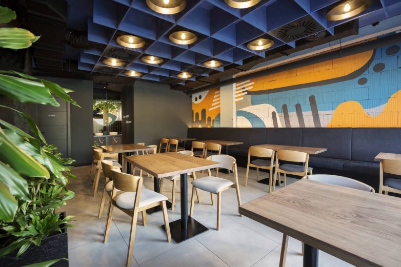 OSB ploče koriste se na više načina – kao zidne obloge, klupe, žardinjere i prepoznatljivi raster “šahovskih polja” na plafonu, koji istovremeno funkcionišu i kao diskretan akustički apsorber.