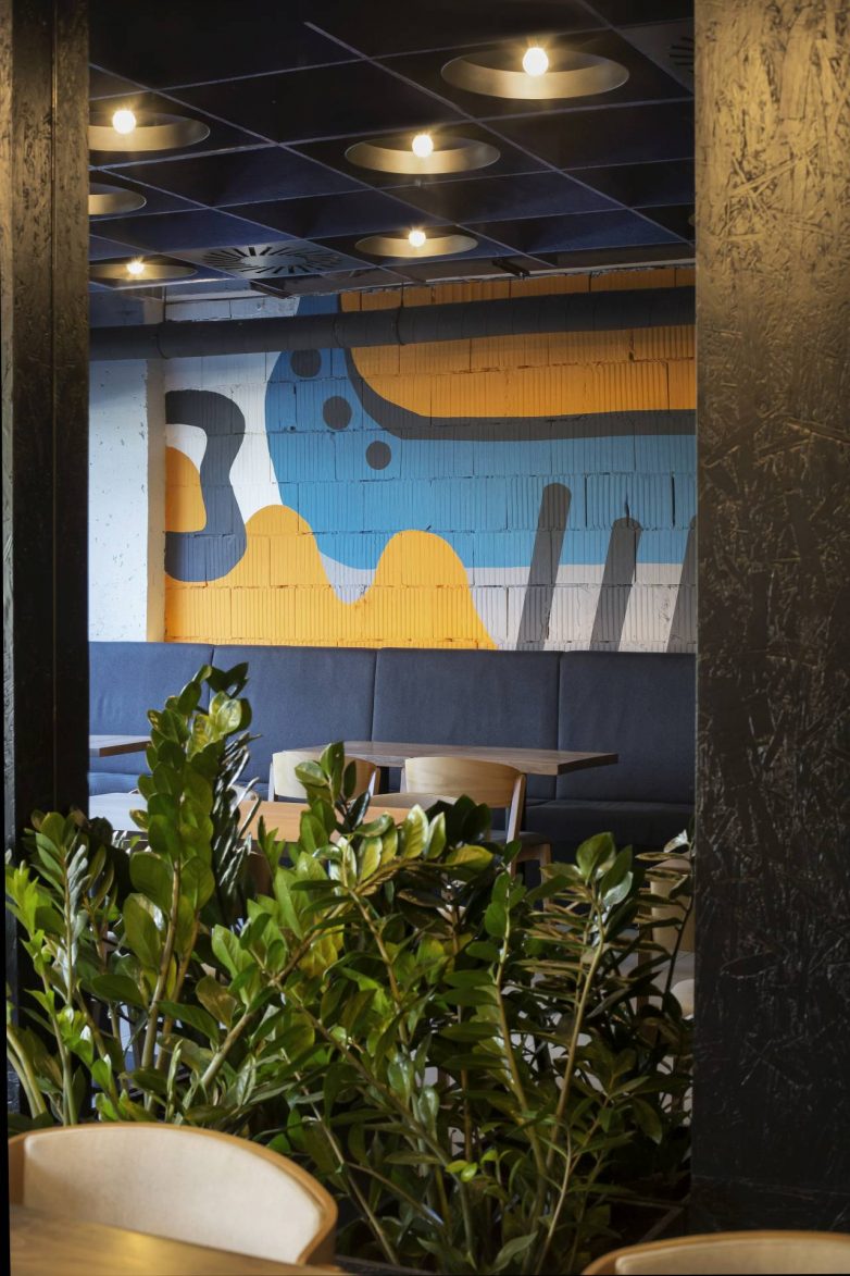 Vizuelni identitet snažno je oblikovan muralima Nine Zvezdin, oslikanim direktno preko sirovih blokova. Dominacija plave i narandžaste boje donosi energiju i vizuelni ritam, dok hladniji materijali poput betona i čelika stvaraju ravnotežu.
