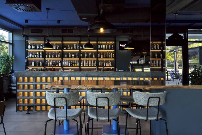 Centralni šank od šupljih betonskih blokova sa LED rasvetom pravi je vizuelni magnet i jedan od osnovnih orijentira u prostoru.