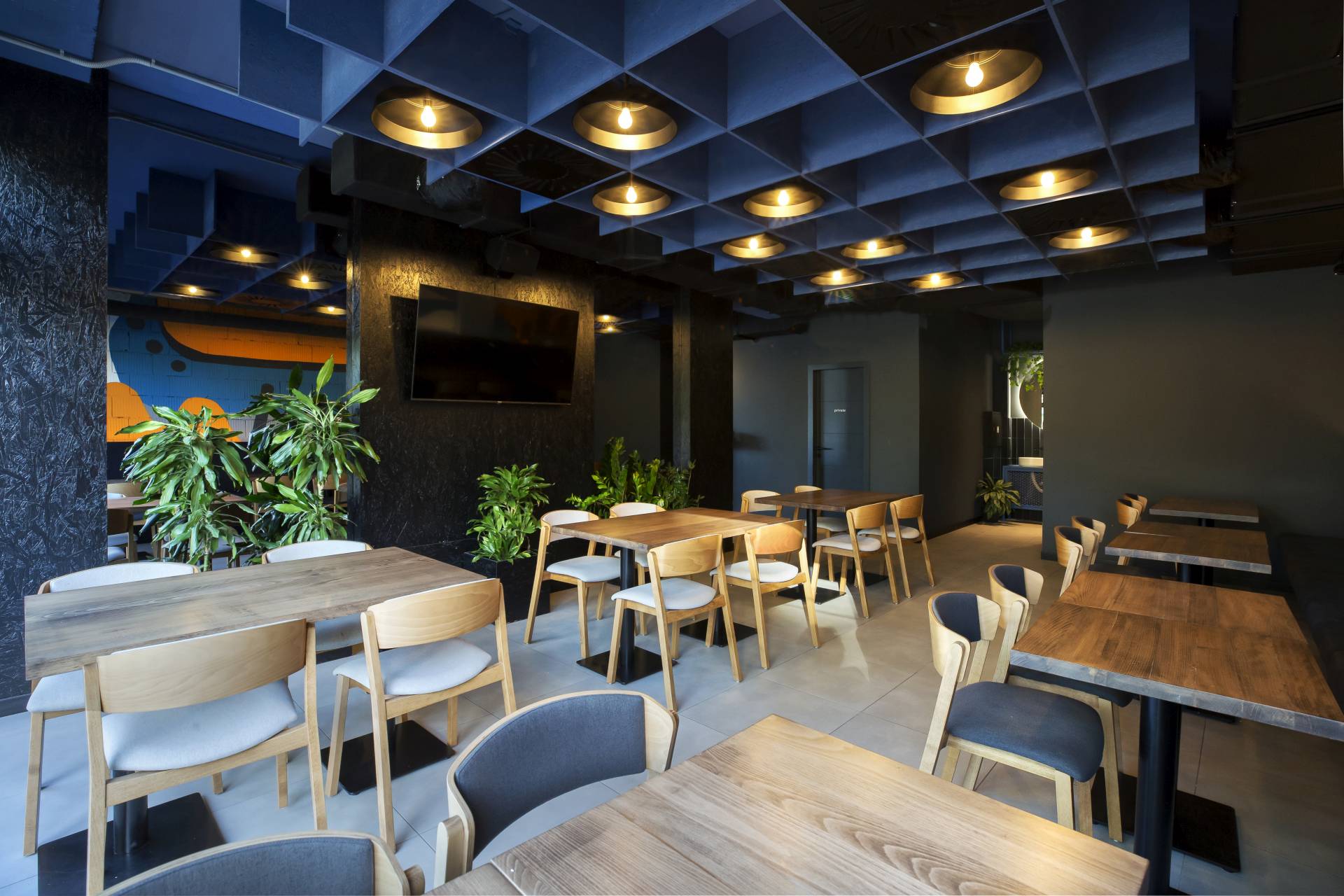OSB ploče koriste se na više načina – kao zidne obloge, klupe, žardinjere i prepoznatljivi raster “šahovskih polja” na plafonu, koji istovremeno funkcionišu i kao diskretan akustički apsorber.