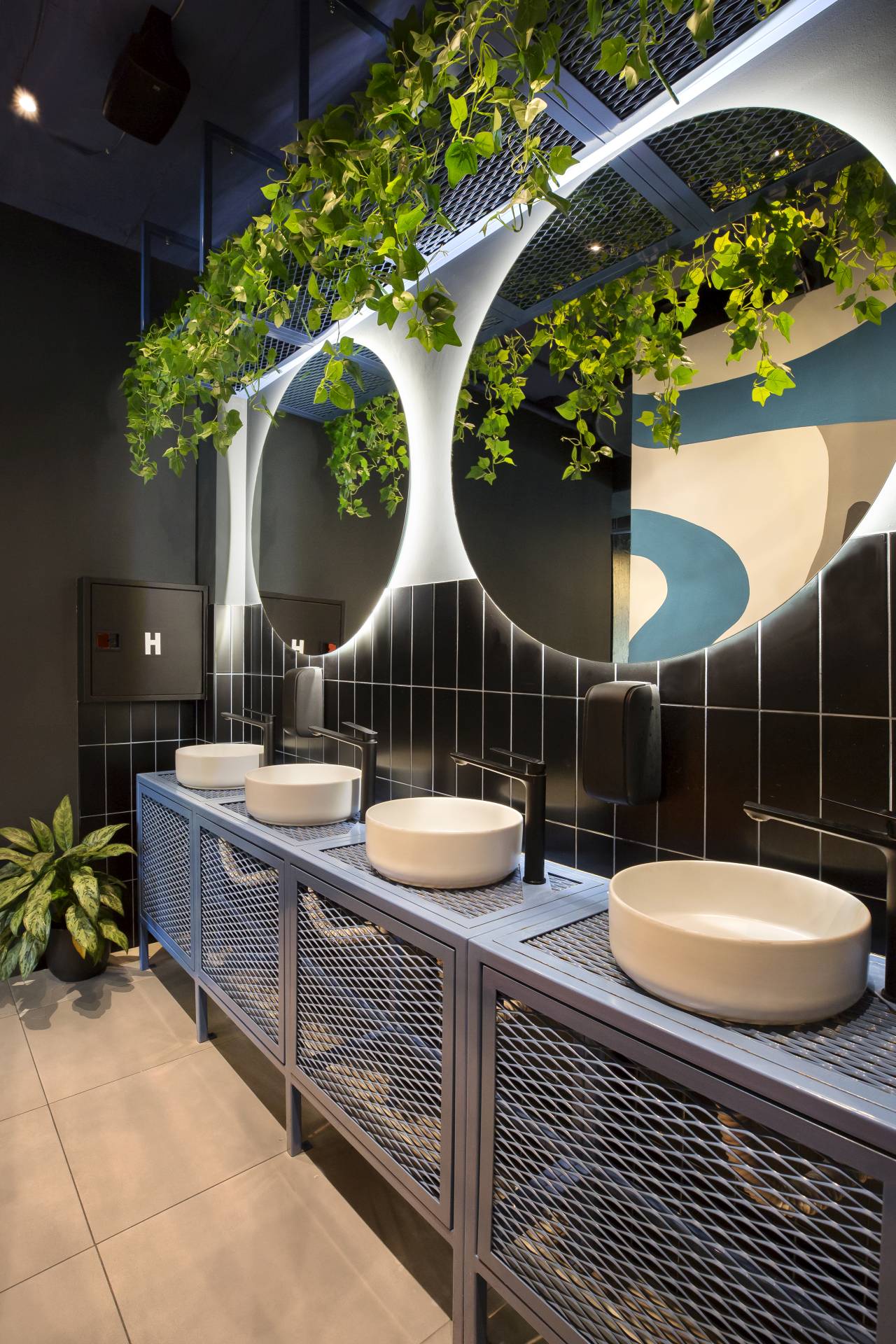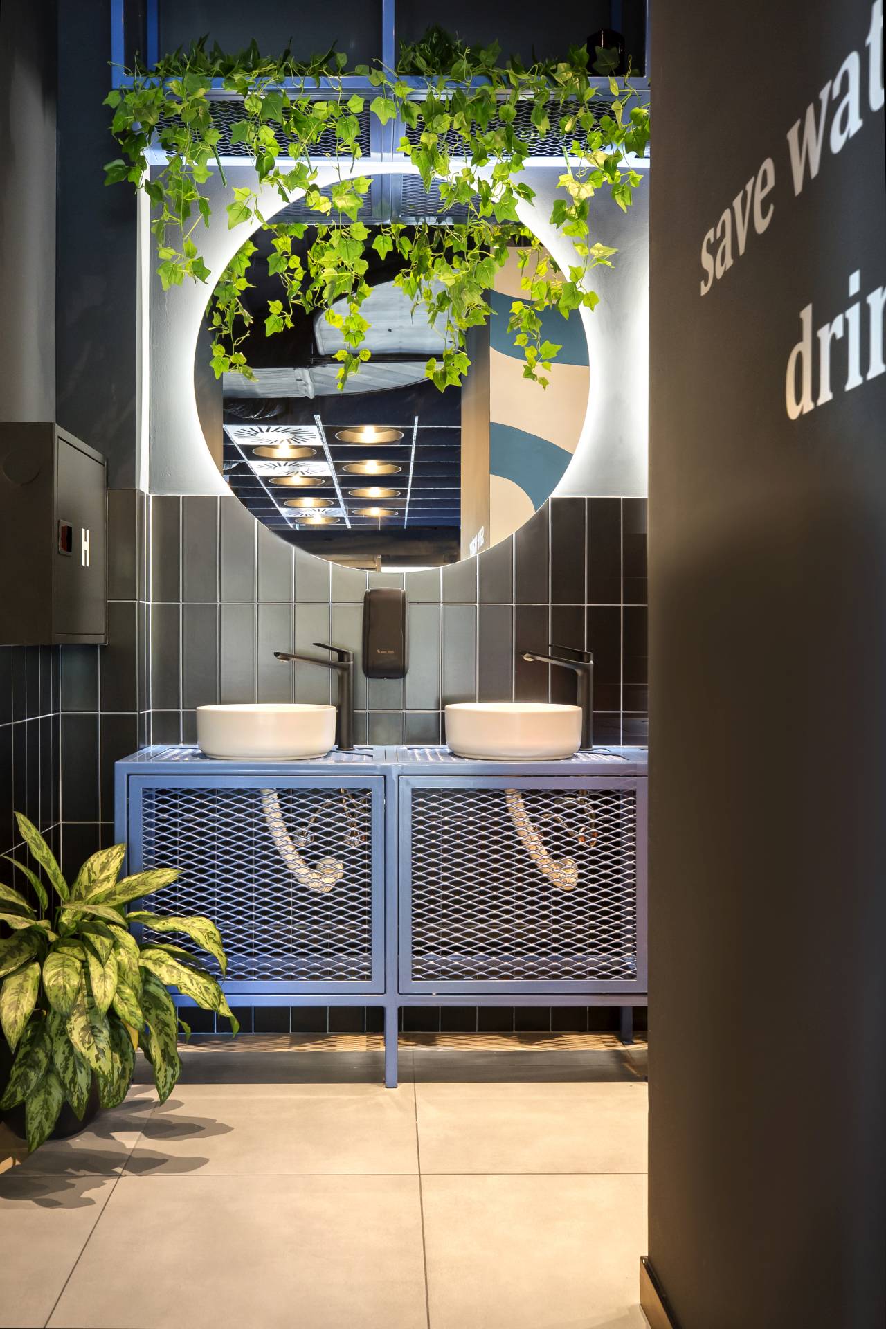 Kombinacija tri zone, jasna funkcionalnost i dosledno sproveden identitet čine ga prostorom koji se lako menja tokom dana, od restorana do živog noćnog bara.