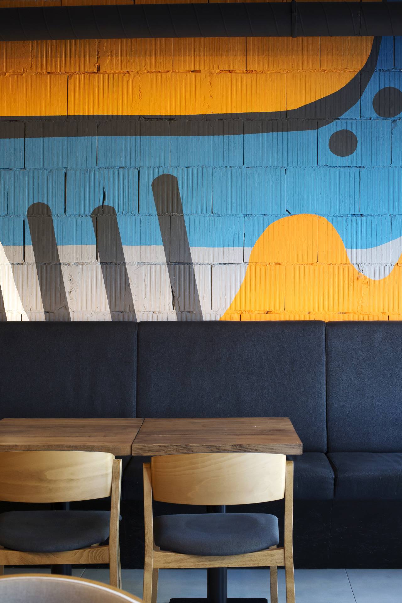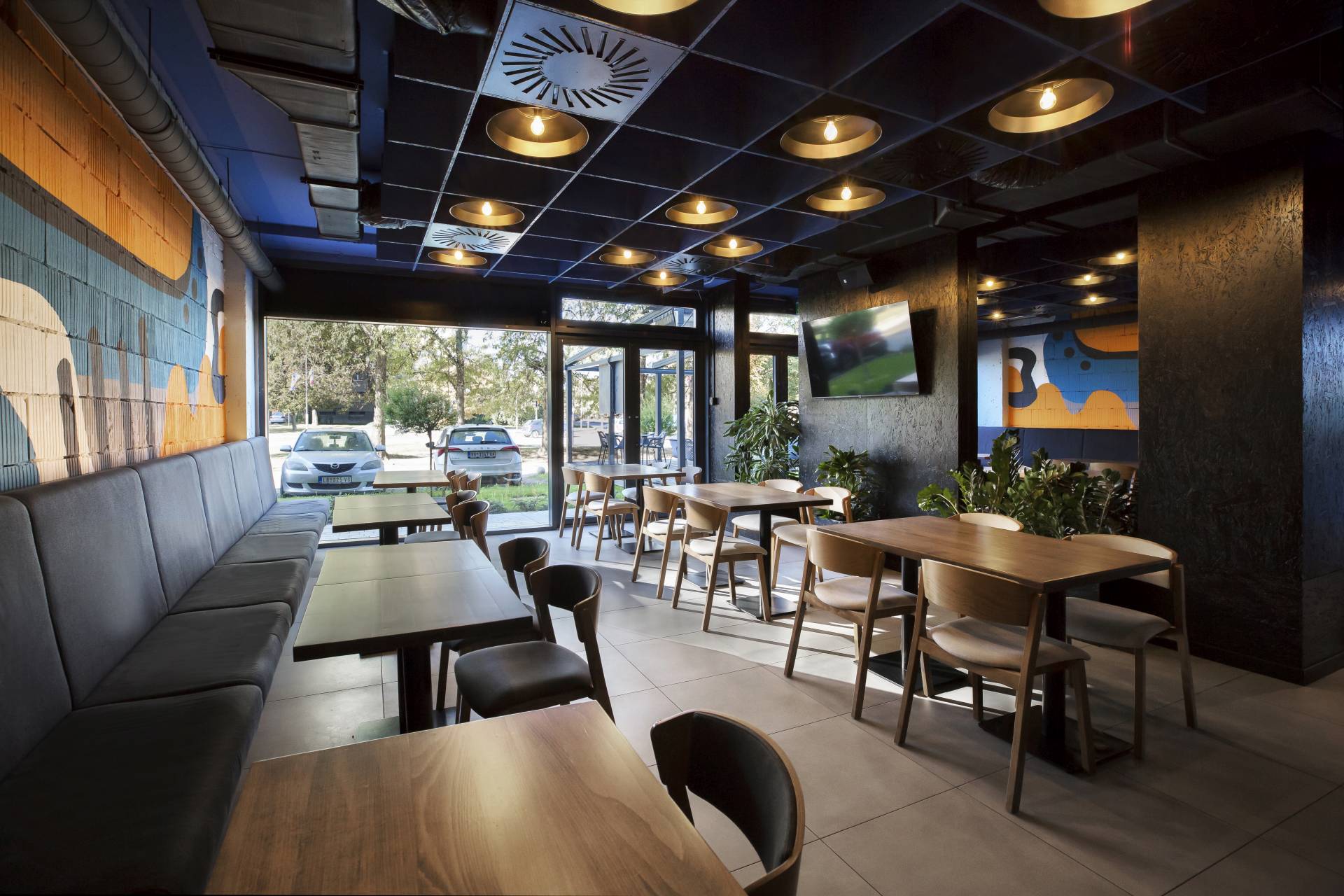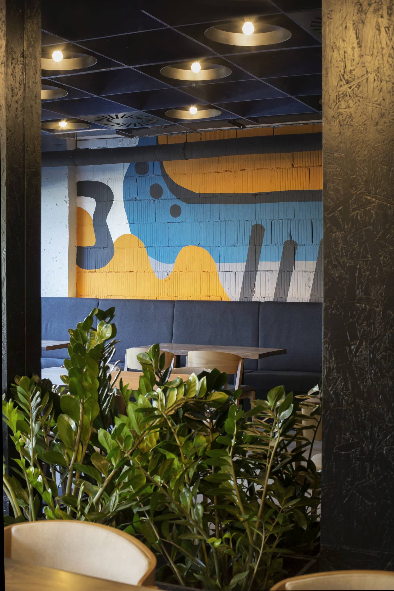 Murali Nine Zvezdin snažno oblikuju identitet, dok OSB plafon, barski sto od punog drveta na betonskom postamentu i zidovi u metalnim ramovima sa armaturnim šipkama doprinose slojevitosti enterijera.
