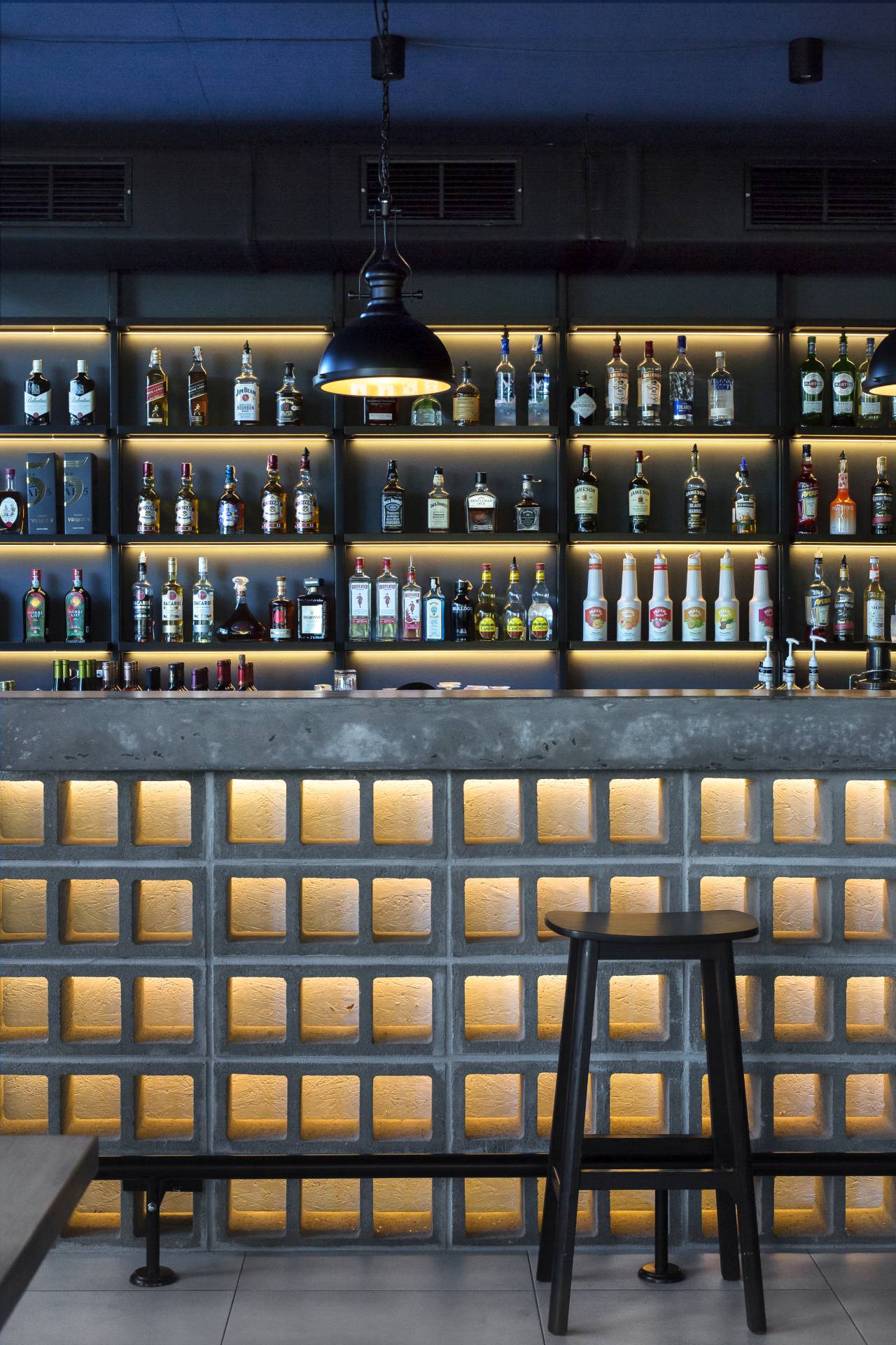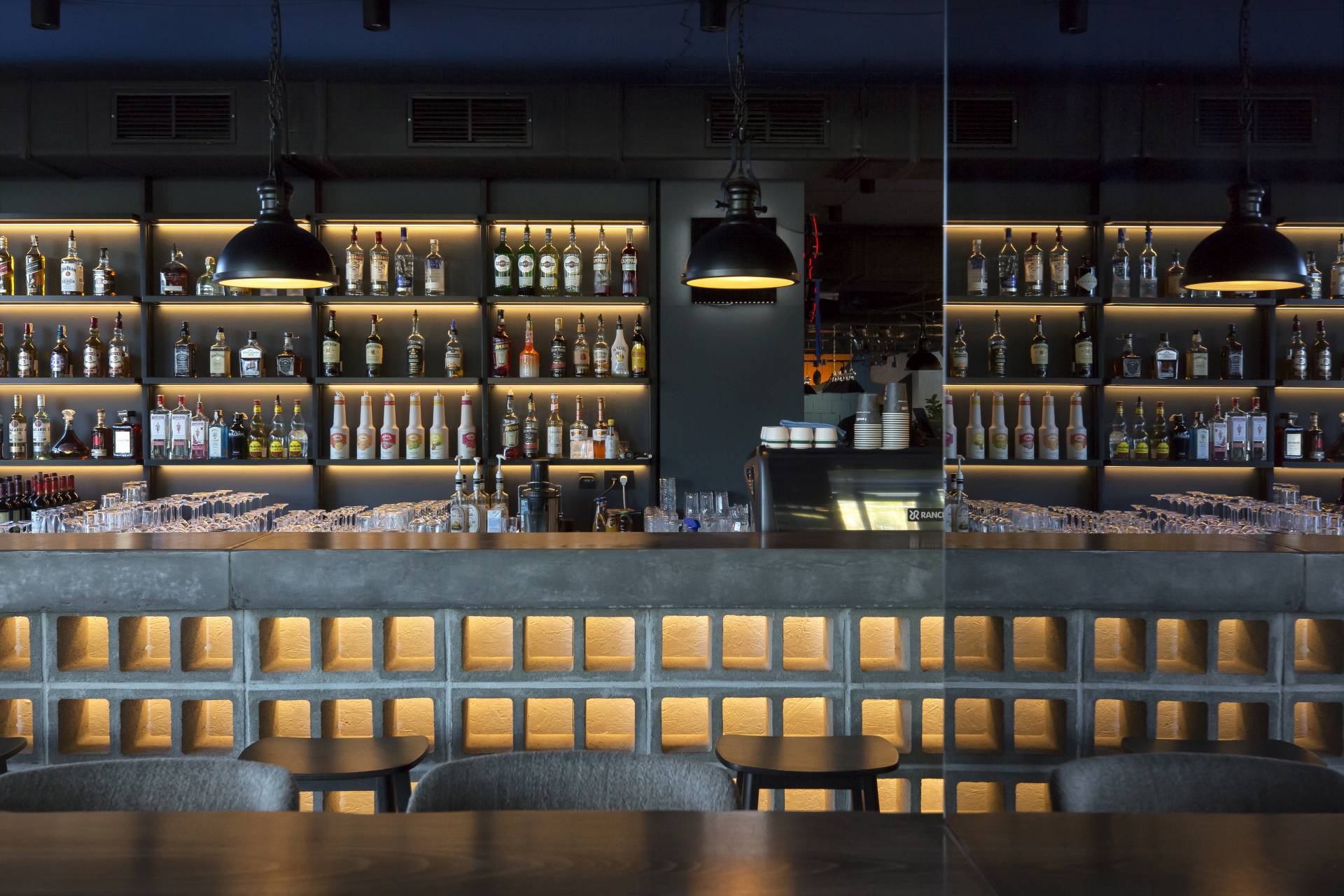 Centralni šank od šupljih betonskih blokova sa LED rasvetom pravi je vizuelni magnet i jedan od osnovnih orijentira u prostoru.
