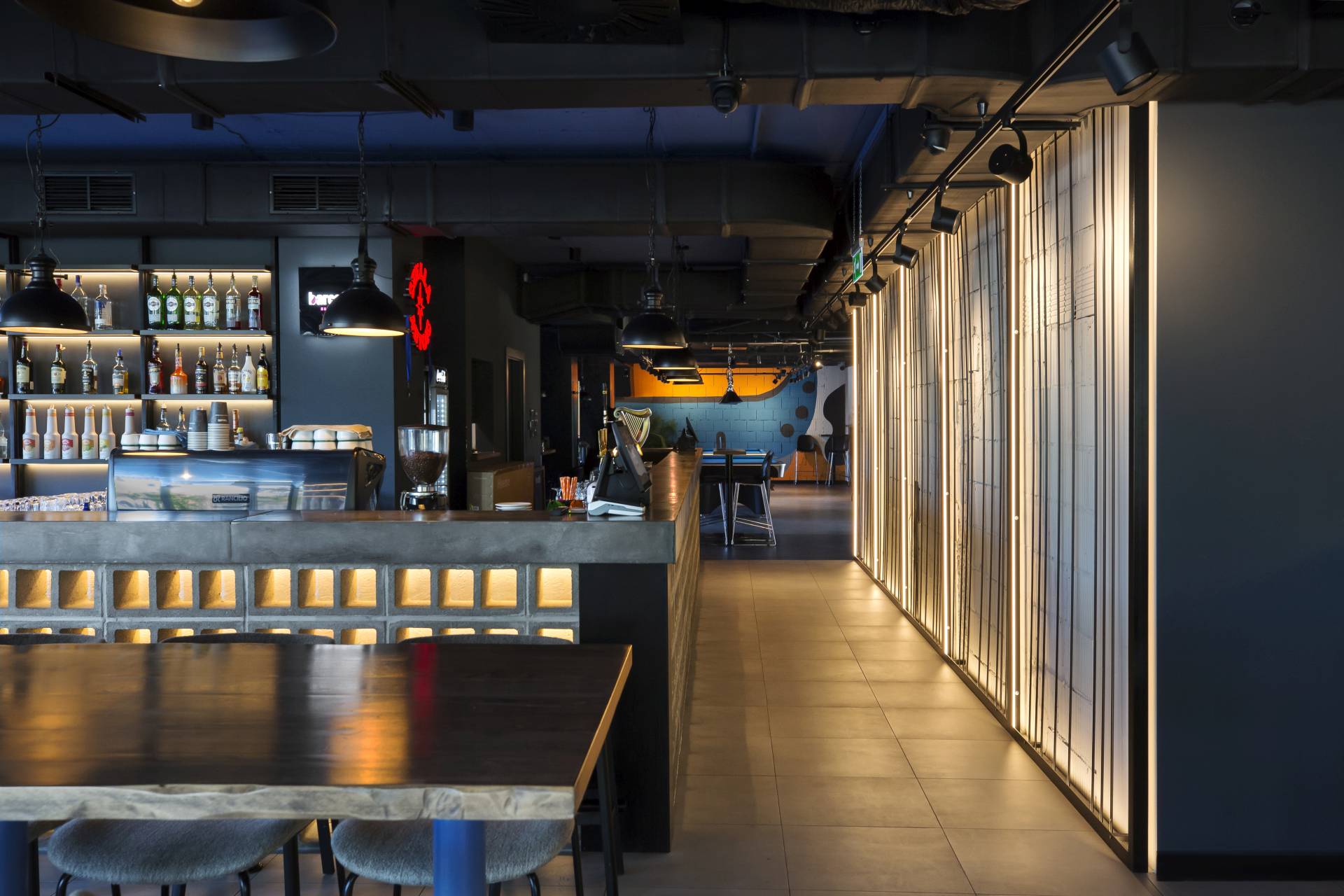 Pošto je lokal u prizemlju poslovne zgrade, cilj je bio da se prostor podjednako dopadne i mladim profesionalcima tokom pauze za ručak, i posetiocima koji ga posećuju u večernjem, više barskom okruženju.