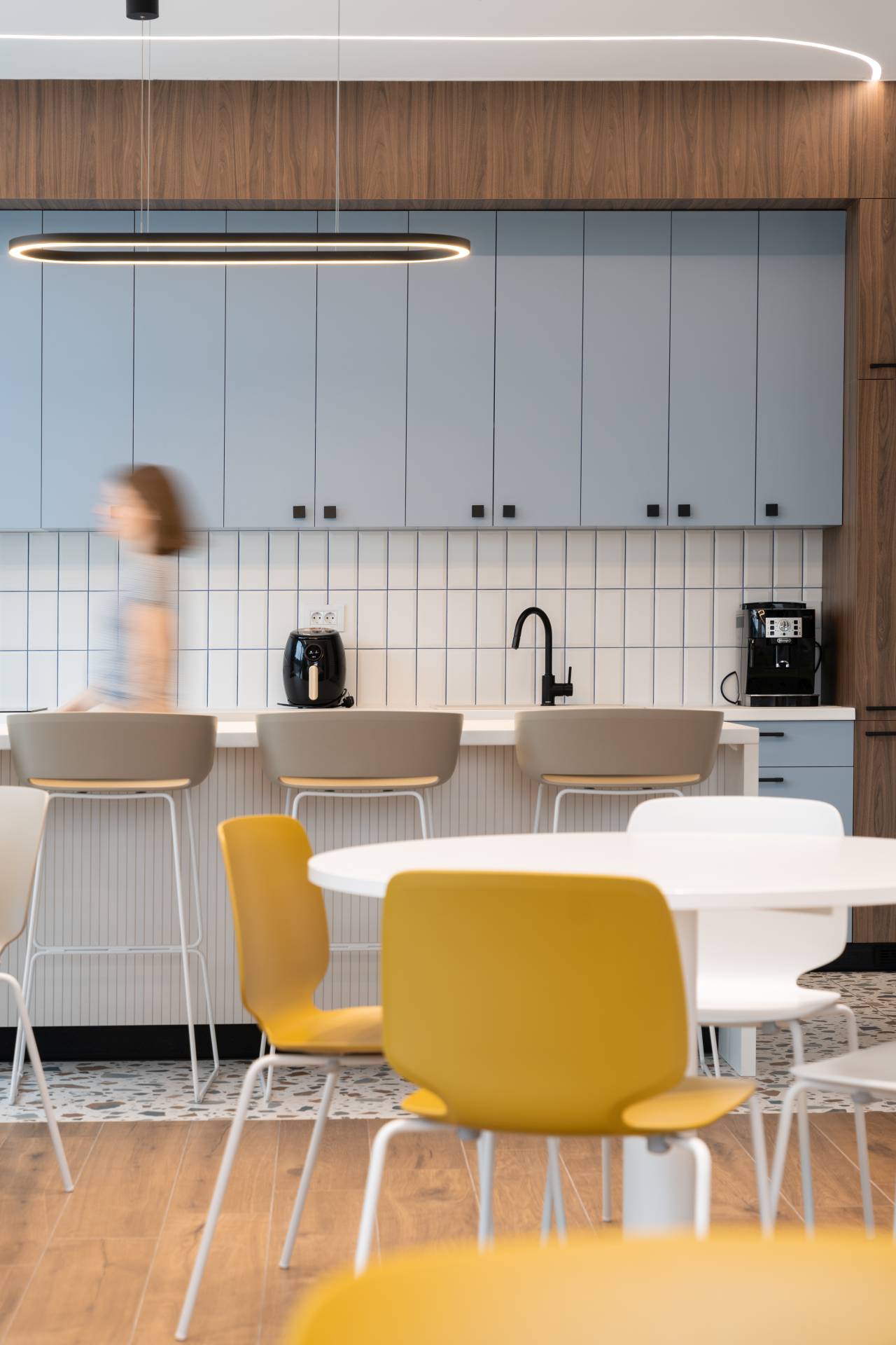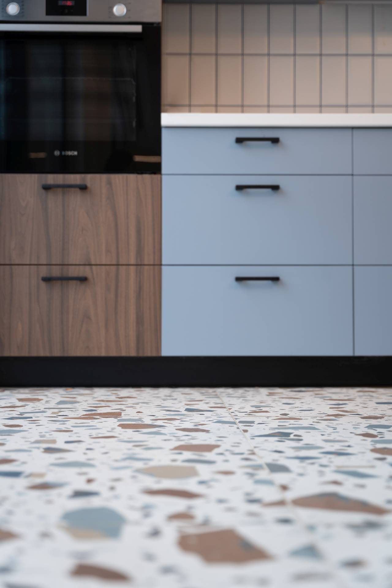 „Boje i teksture kuhinjskih elemenata u potpunosti su inspirisane podnim oblogama“, dodaje Marinkov. „U toj prostoriji sam imala slobodu da unesem malo raznovrsnosti i učinim prostor razigranim i primamljivim za okupljanje.“