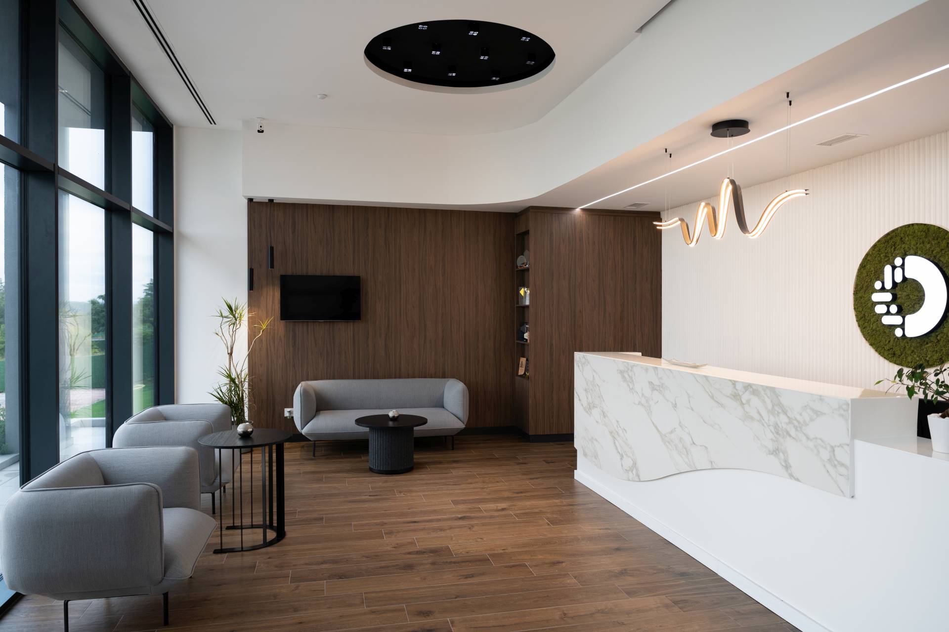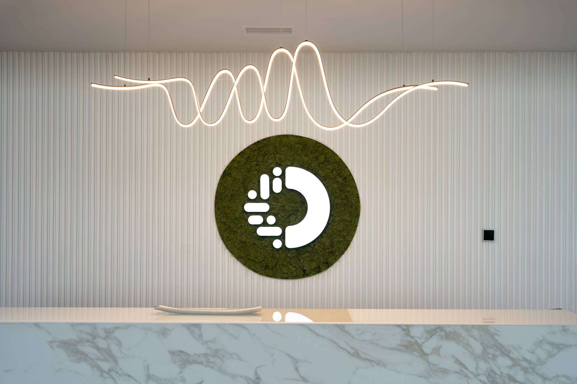 Na ulazu dominira niša ispunjena mahovinom, koja uokviruje svetleći logo kompanije. Taj zeleni akcenat, u kontrastu sa mermernim pultom i kanelurisanim panelima, prenosi delić prirode u enterijer i stvara upečatljiv prizor za prolaznike.