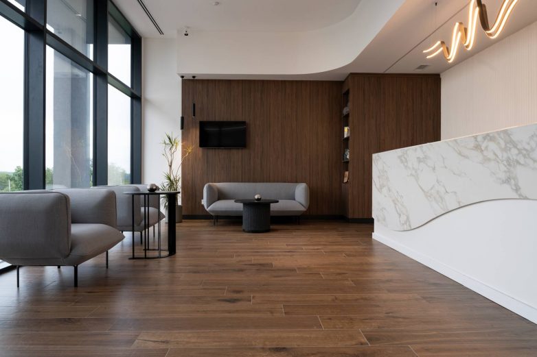 Poseban akcenat stavljen je na recepciju i izložbenu salu, prostorije koje odišu toplinom i prefinjenošću. „Ove dve prostorije povezane su liftom i međusobno se nadovezuju u estetici“, kaže Marinkov.