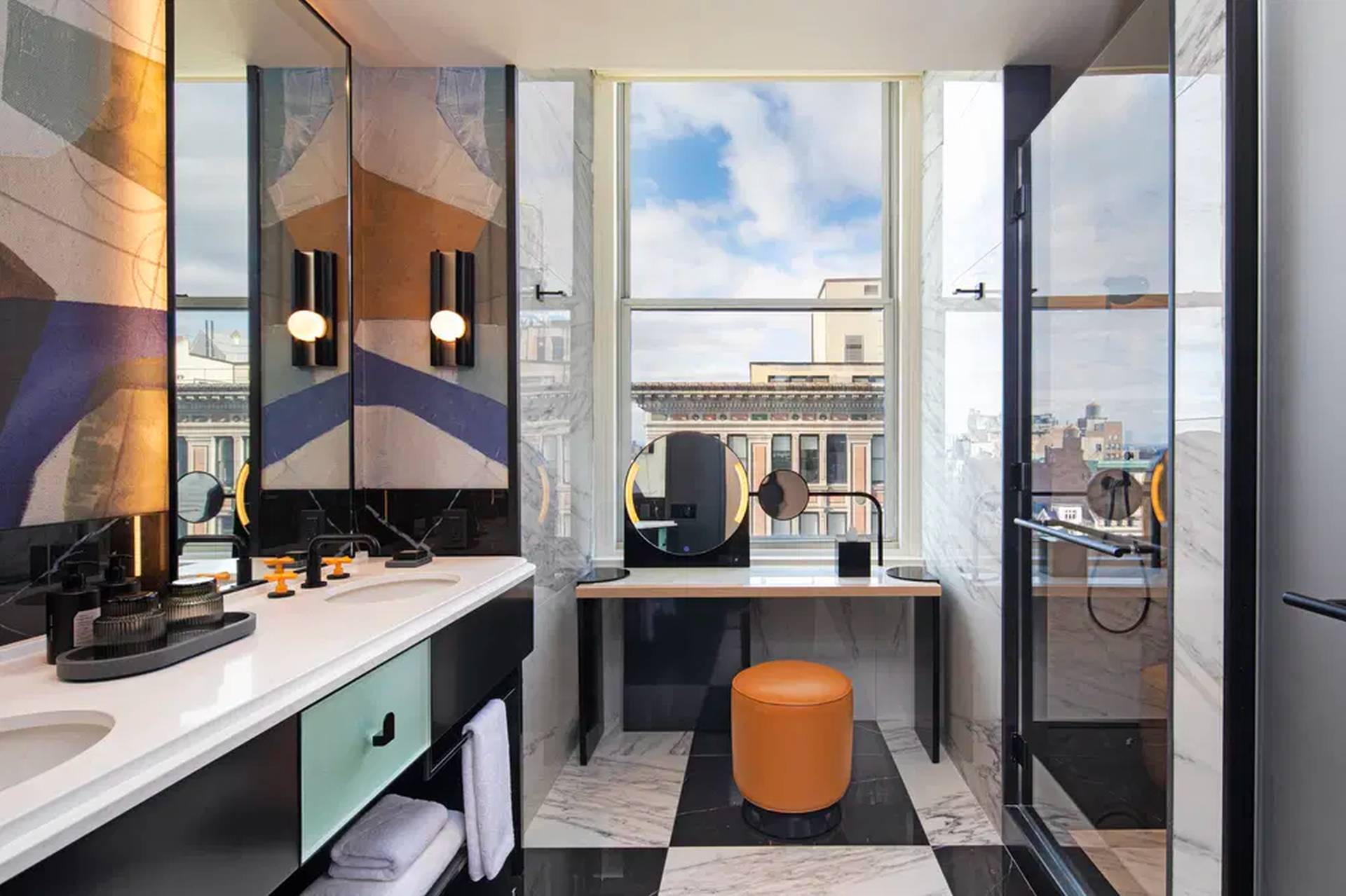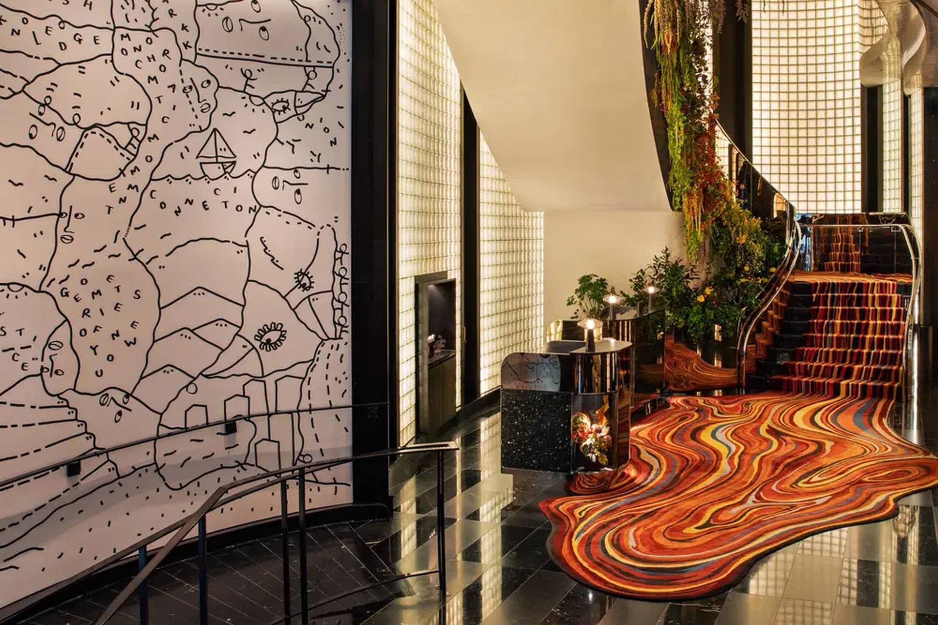 U samom ulazu, mural umetnice Šantel Martin (Shantell Martin) uvodi goste u priču hotela, dok podovi i zidovi od staklenih blokova stvaraju snažan vizuelni ritam.