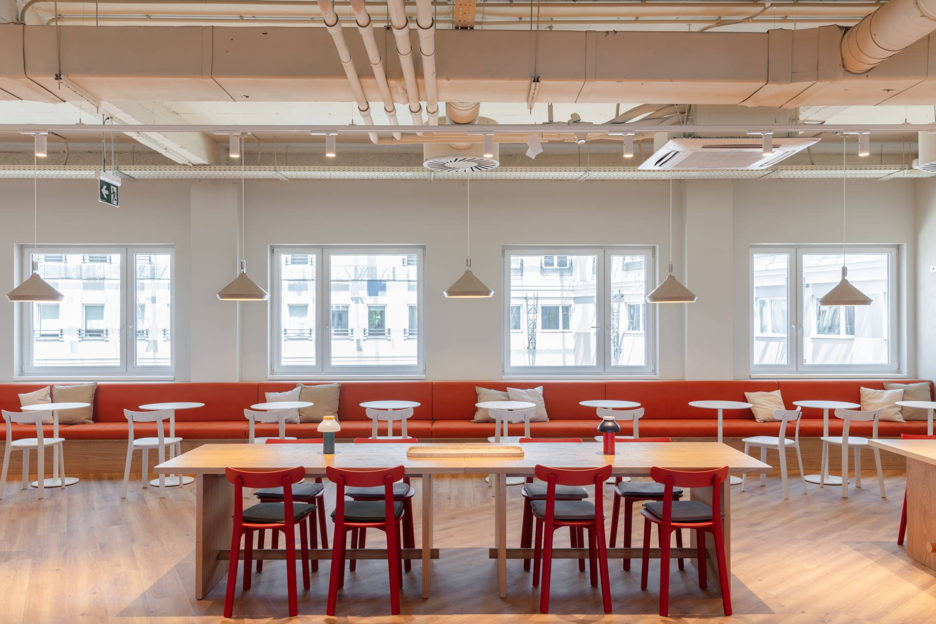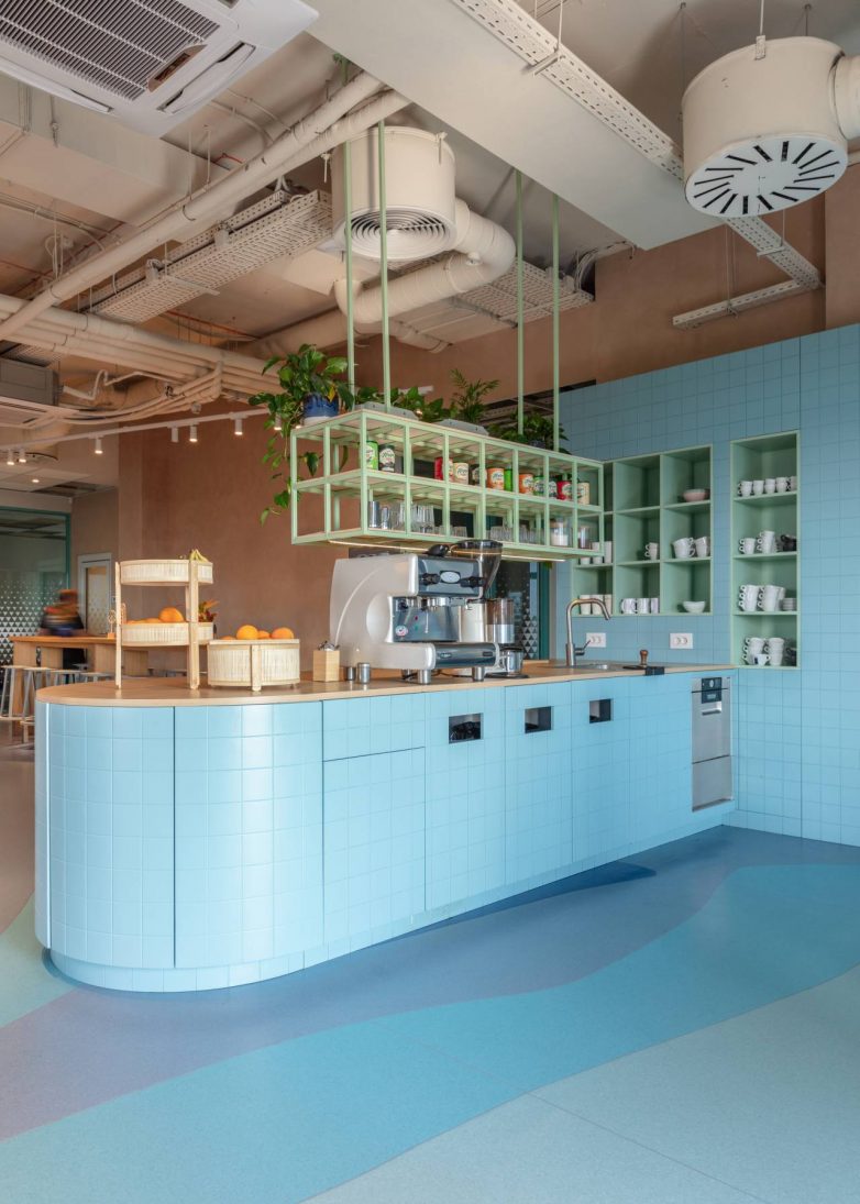 Vinil se koristi u frekventnim zonama – „coffee pointovima“ i kantini – kako bi se osiguralo lakše održavanje i dinamika prostora.