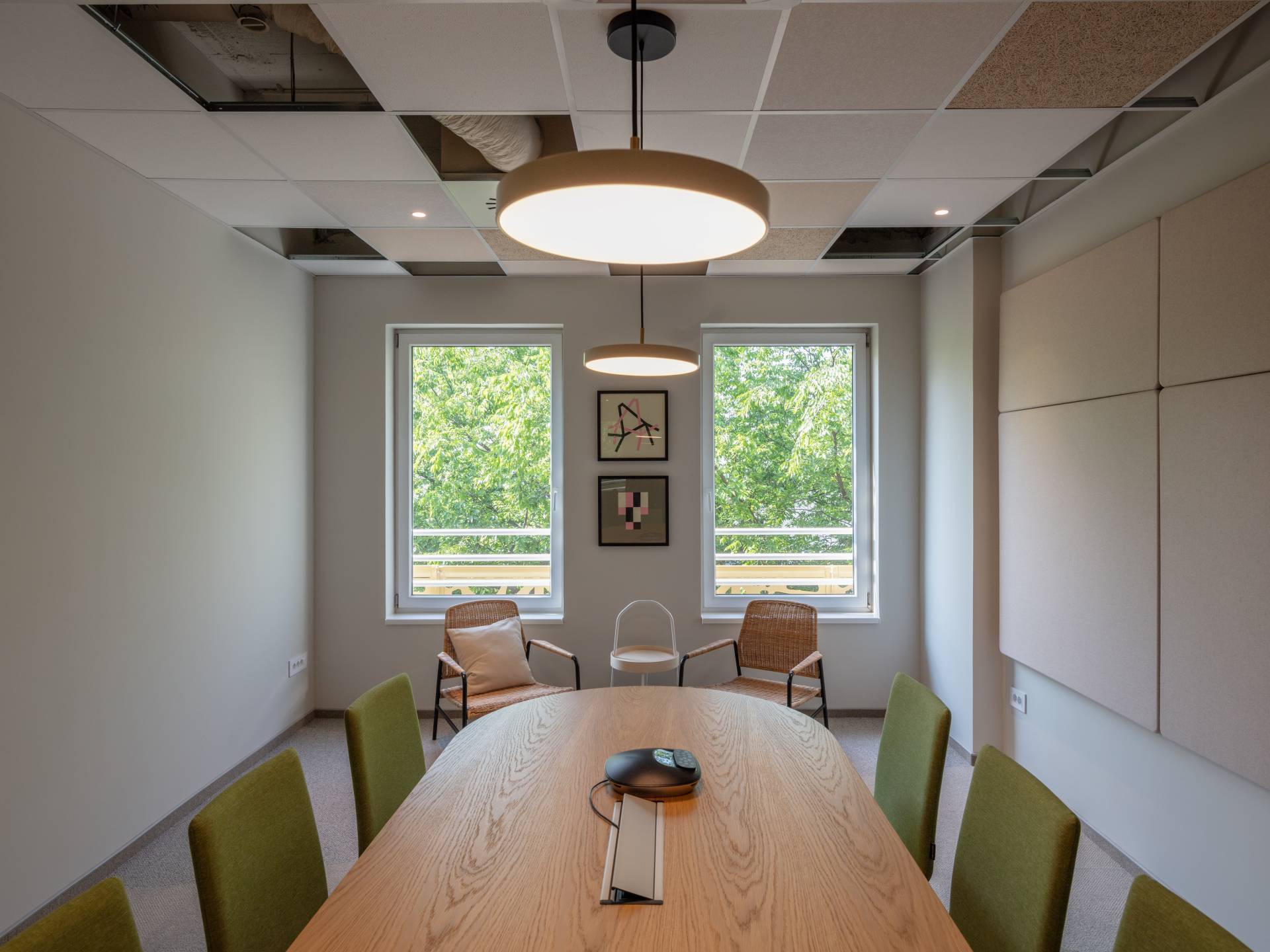 U salama za sastanke i „single boothovima“ korišćeni su zvučni paneli, dok su u određenim delovima poluotvorenog plafona postavljeni paneli od drvenih vlakana. Na ovaj način obezbeđen je akustički komfor koji odgovara različitim tipovima rada.