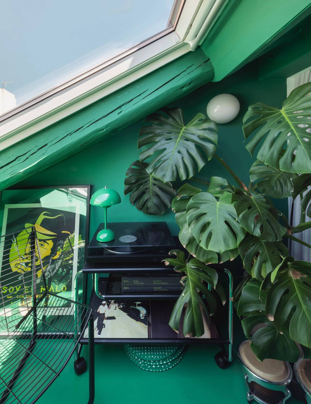 Zelena boja u delu ispod krovnog prozora stvara vezu sa spoljašnjim svetom, a pogled ka nebu daje utisak male urbane terase.