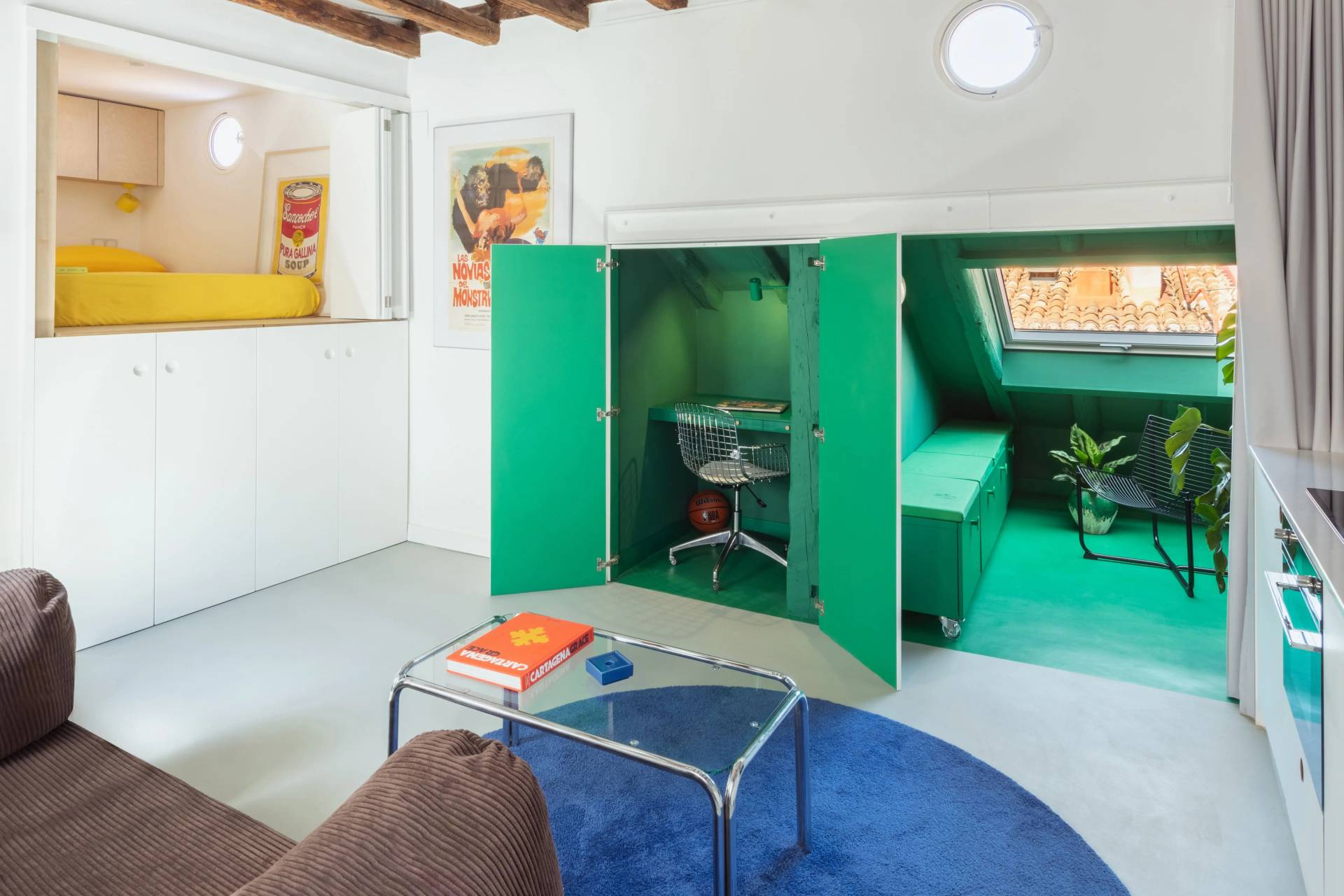 Kada se otvore, pojavljuju se snažni koloristički akcenti – kupatilo obloženo sjajnim plavim mozaikom, prostor za odlaganje ispod kreveta u intenzivnoj žutoj i tavanski deo definisan živom zelenom bojom.