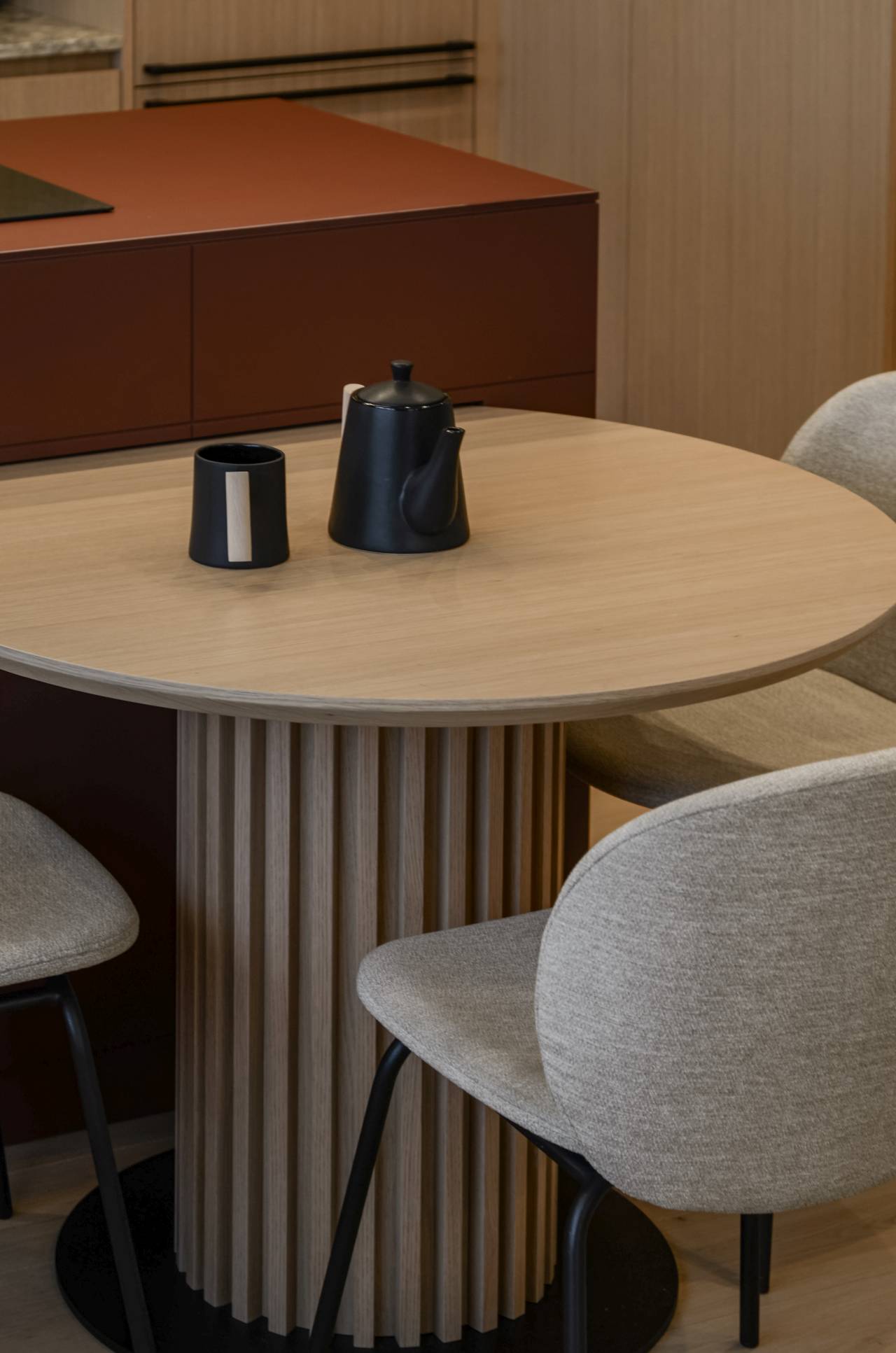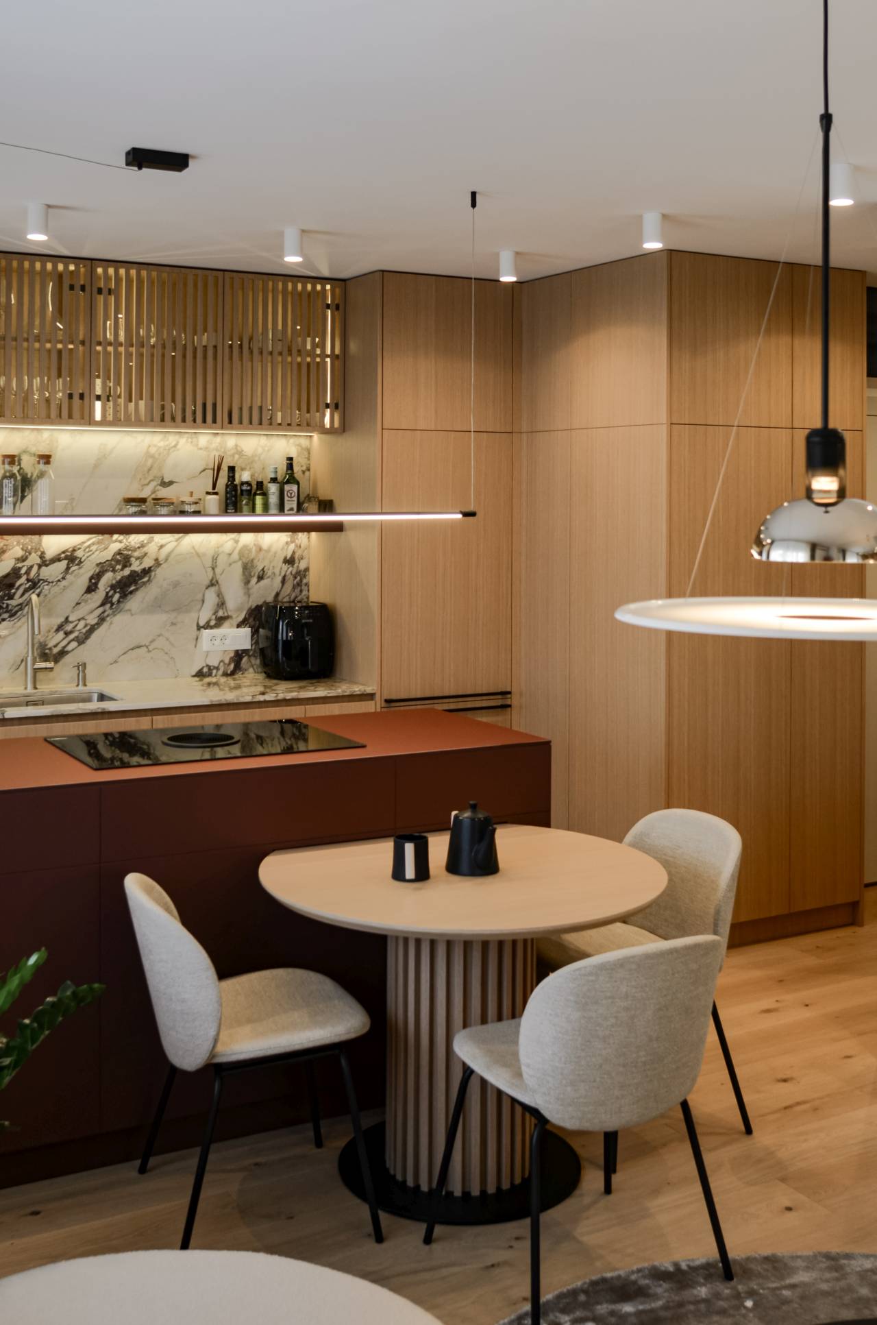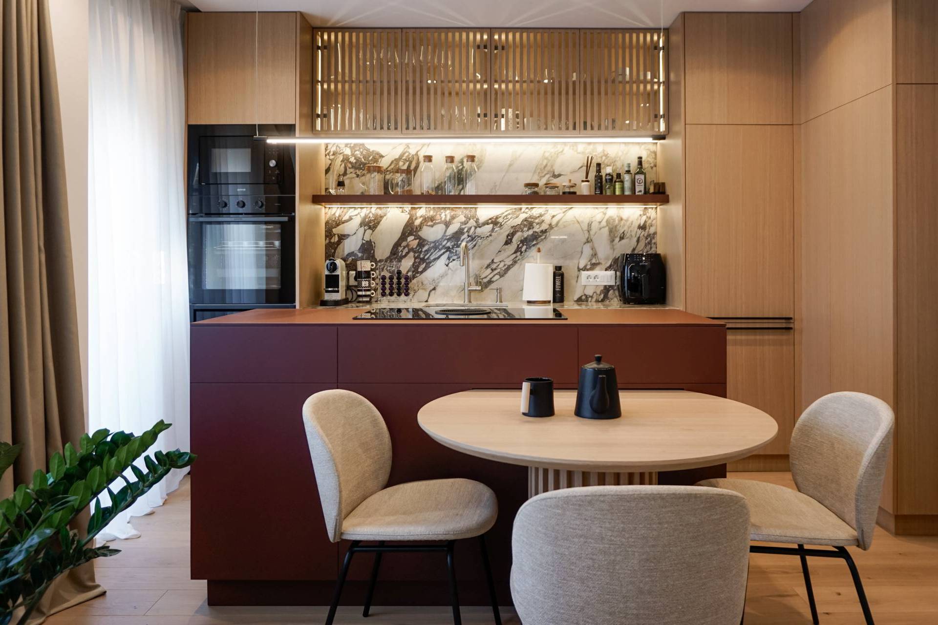 „Prostor je podeljen na jasno definisane, ali vizuelno povezane zone, uz integraciju trpezarijskog stola u kuhinjski pult kako bi se optimizovala cirkulacija i dobio kompaktan dnevni prostor„, navode iz studija.
