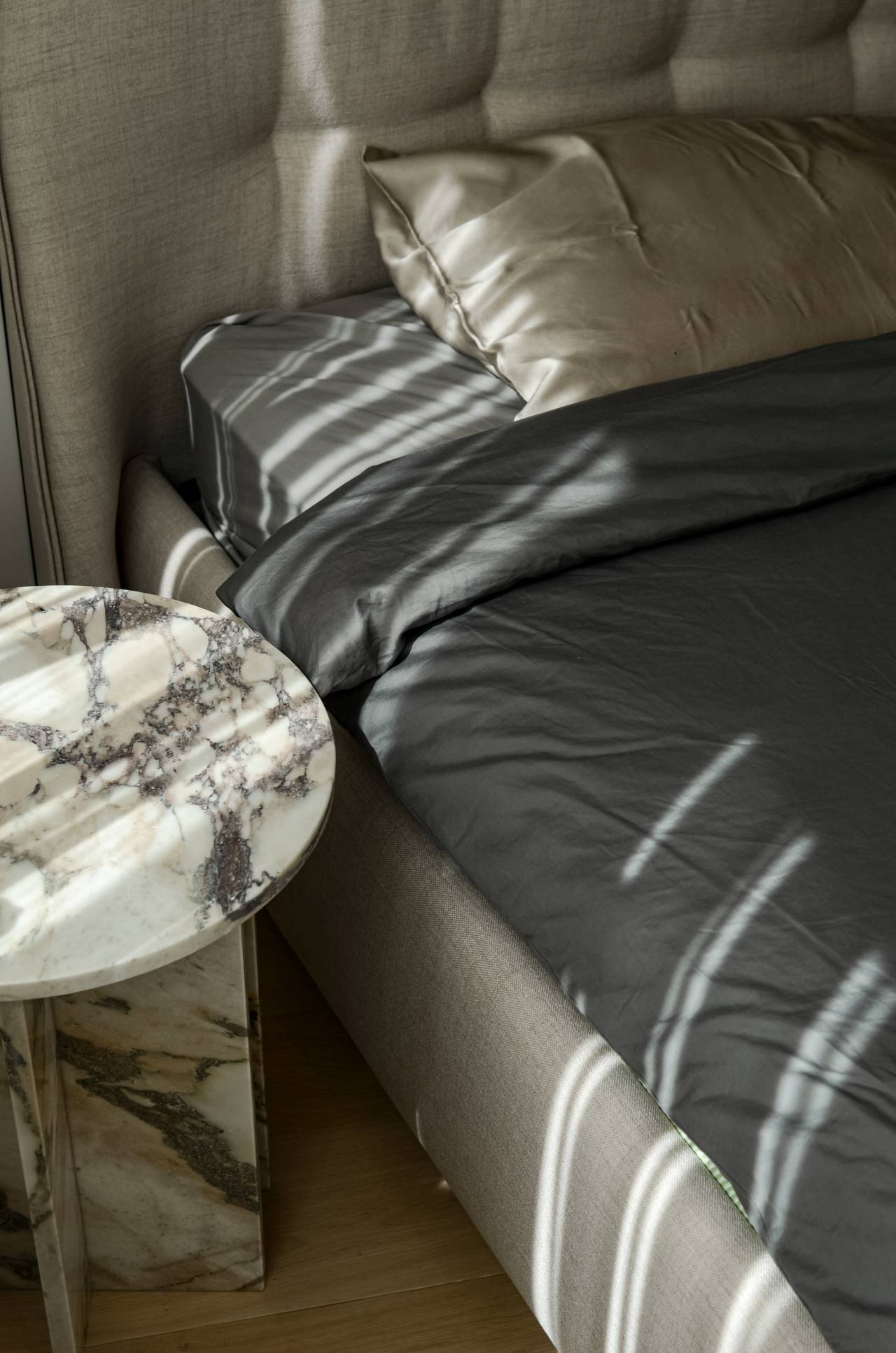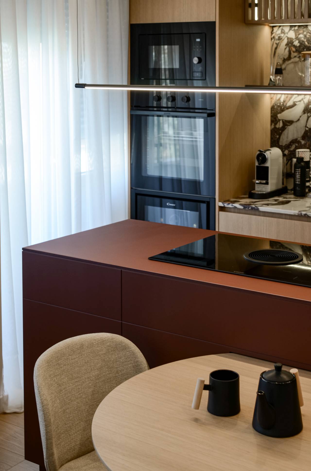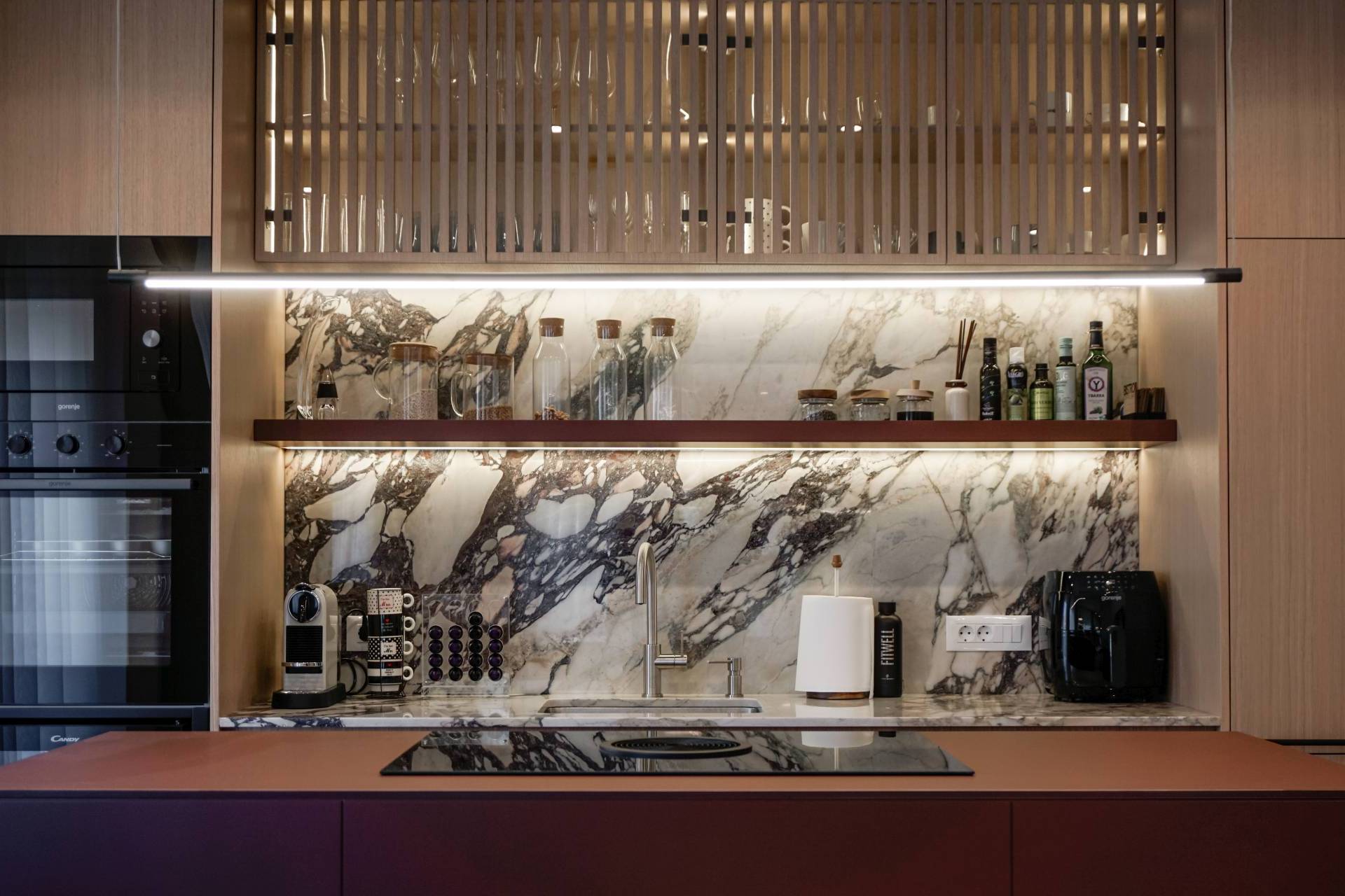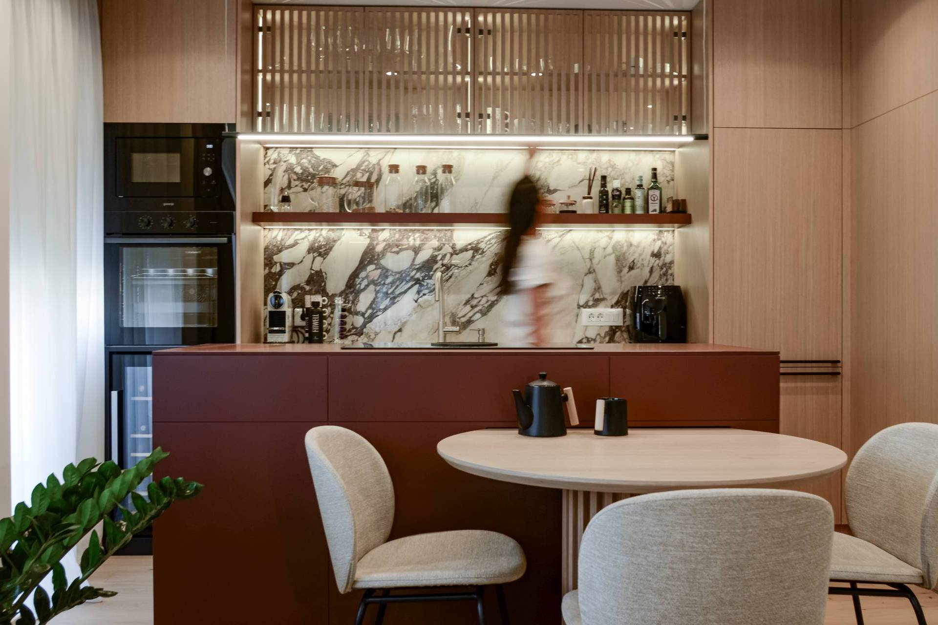 U enterijeru su korišćeni Calacatta Viola mermer, farbani medijapan, tapet-vrata i nameštaj rađen po meri. „Materijali su birani prema kriterijumu trajnosti, taktilnosti i vizuelnog identiteta, a ne trenda“, ističu arhitekte.