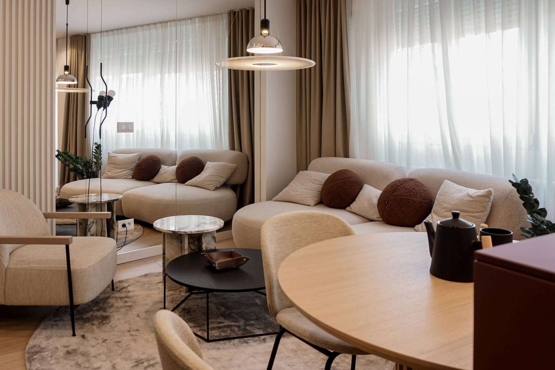 Posebnu ulogu imaju komadi od mermera, integrisani trpezarijski sto, pažljivo pozicionirana ogledala i kontrolisana, ali izražajna paleta boja, koji zajedno grade atmosferu prostora.