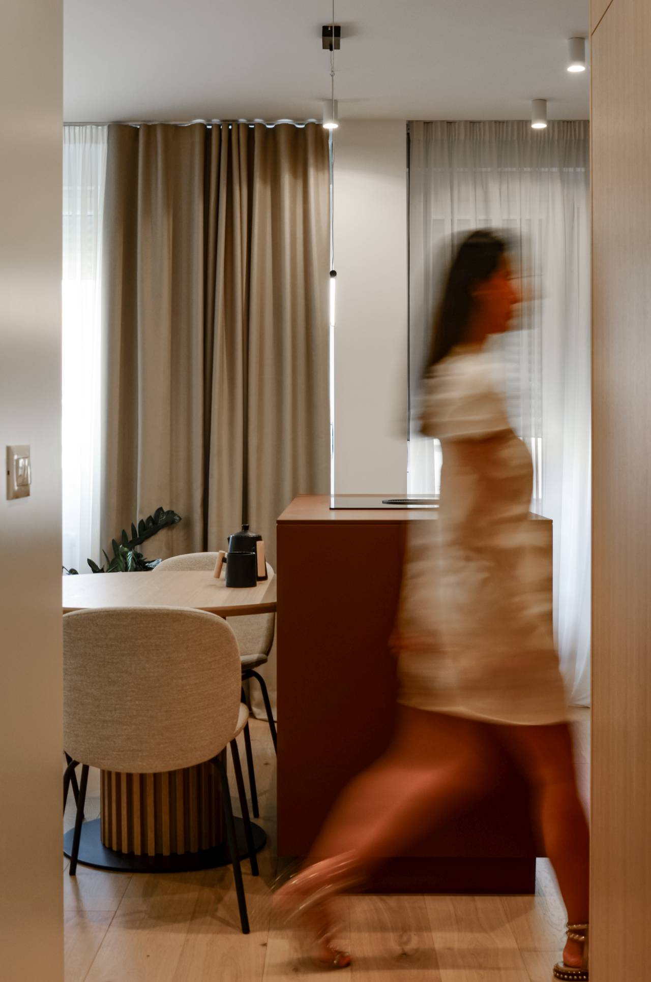 Iako mali, stan je projektovan tako da se prilagođava različitim režimima korišćenja. Osvetljenje je rešeno slojevito, kroz kombinaciju ambijentalne, funkcionalne i akcentne rasvete, dok je akustika poboljšana mekim, zaobljenim formama nameštaja i tekstilima.