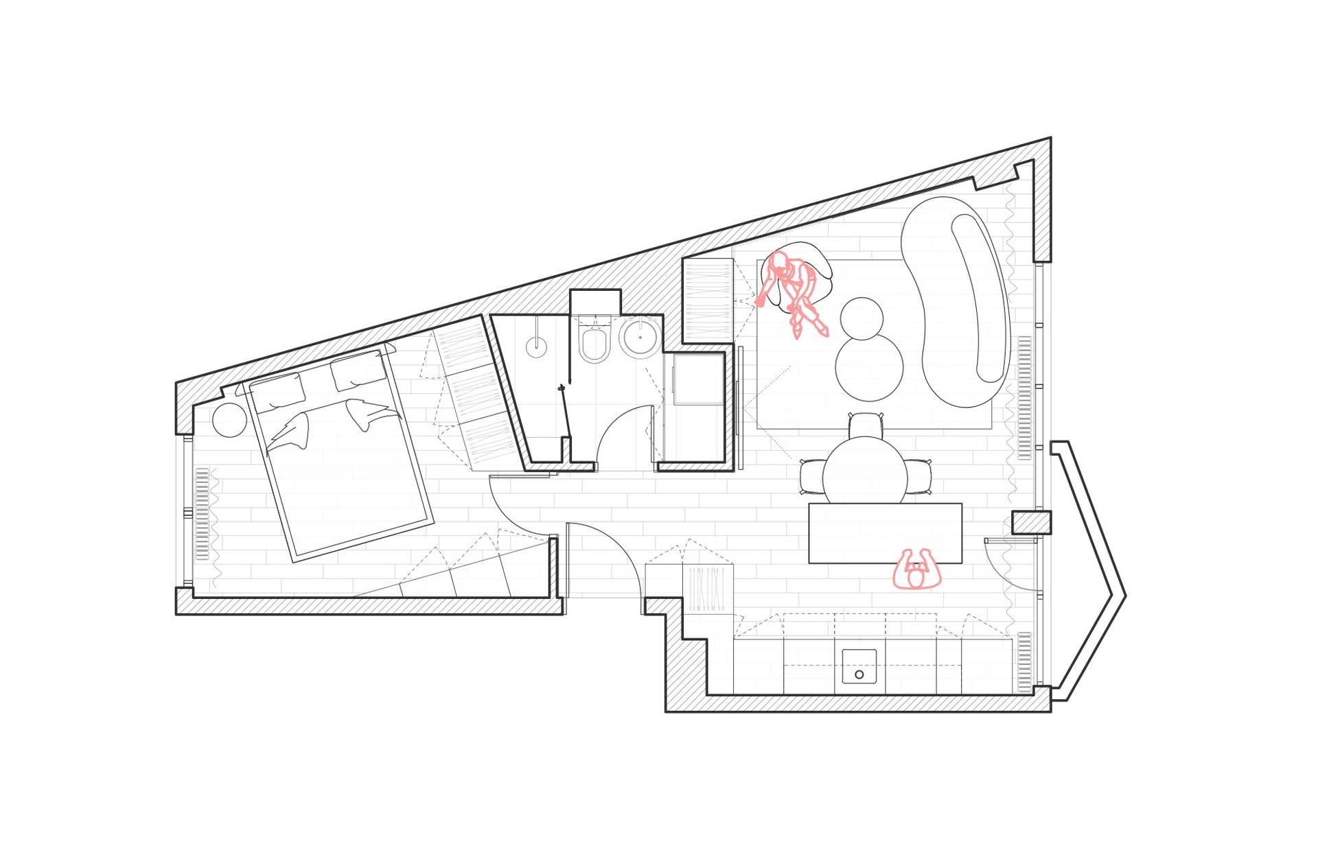 Osnovu stana karakteriše nepravilna, trapezasta forma, sa krivinama i kosinama koje su mogle biti ograničenje, ali su u ovom projektu postale ključni alat u oblikovanju enterijera.