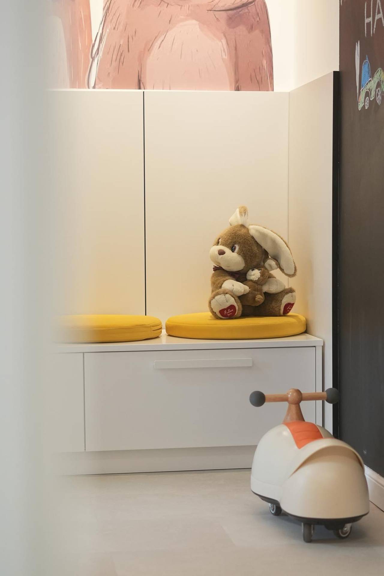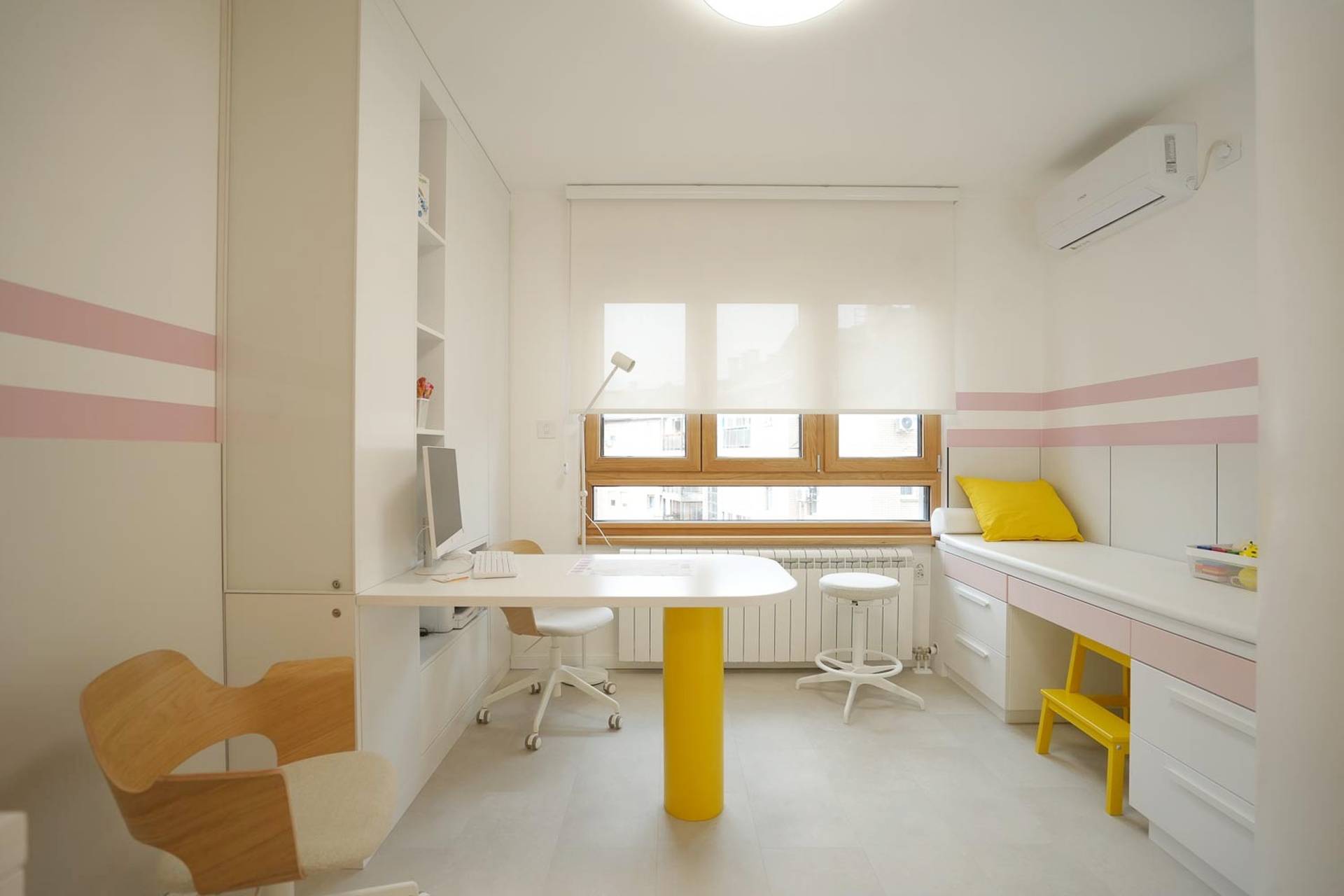 Vlasnica je želela da se u ovom prostoru osmisli pedijatrijska ordinacija po meri dece, ali i lekara. U prostoru koji je prvobitno imao dve prostorije i kupatilo, projektovana je ordinacija koja sadrži hodnik, lekarsku ordinaciju, čekaonicu, laboratorijski deo, lekarsku sobu i kupatilo. Sve ovo organizovano je na svega 36 kvadratnih metara.