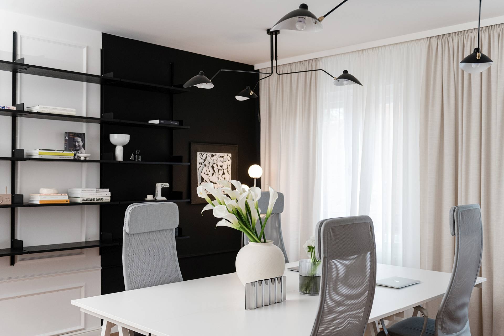 Jedan od ključnih izazova projekta bio je pronalaženje ravnoteže između istorijskog karaktera stana i zahteva savremenog radnog okruženja.