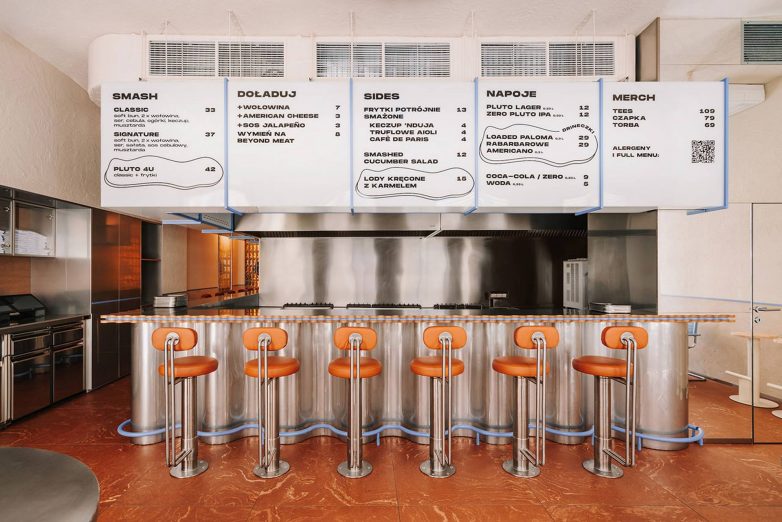 Dugačka metalna konstrukcija bara evocira izgled lokalnog uličnog šaltera, dok otvorena zona za pripremu burgera postaje deo vizuelnog identiteta enterijera.
