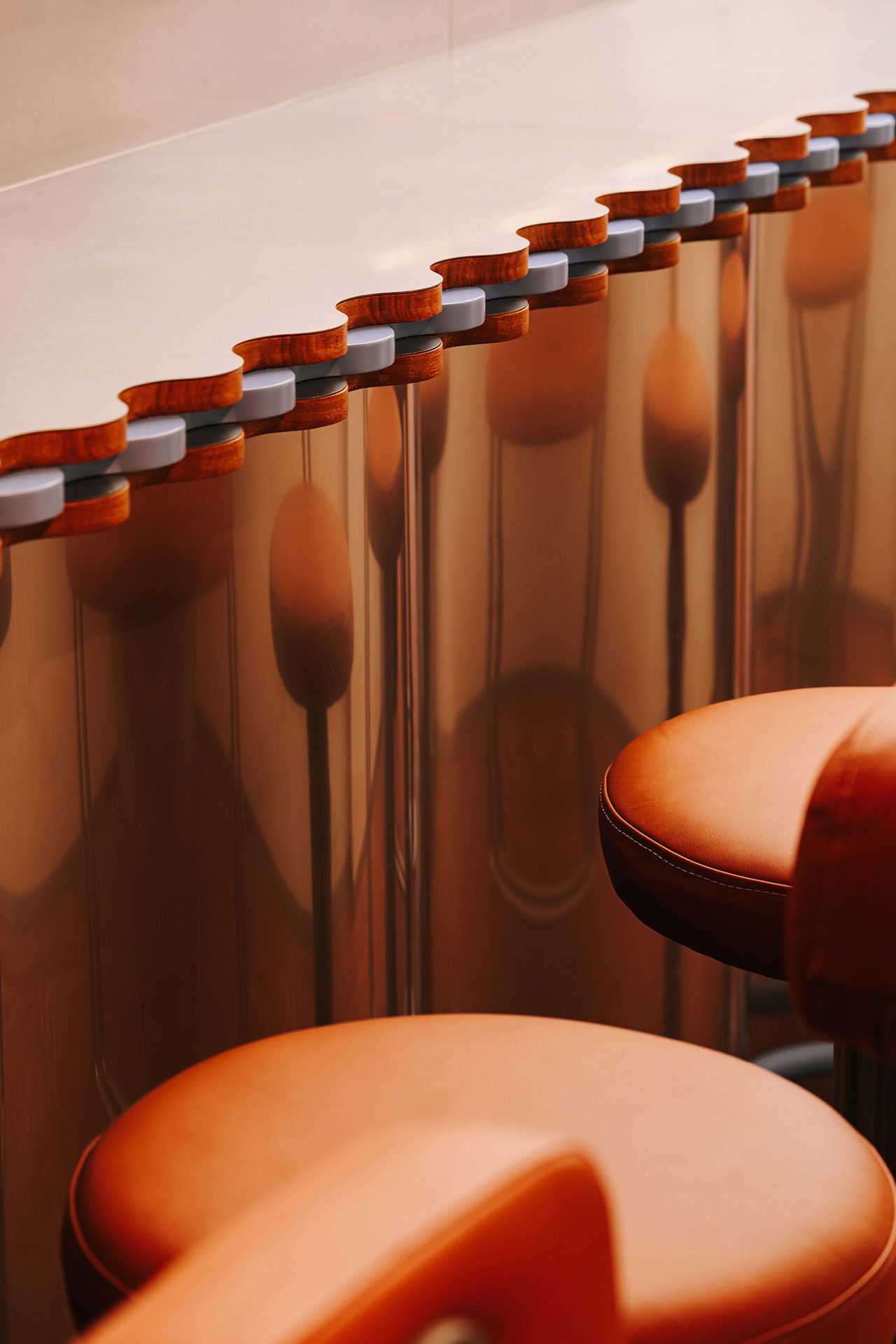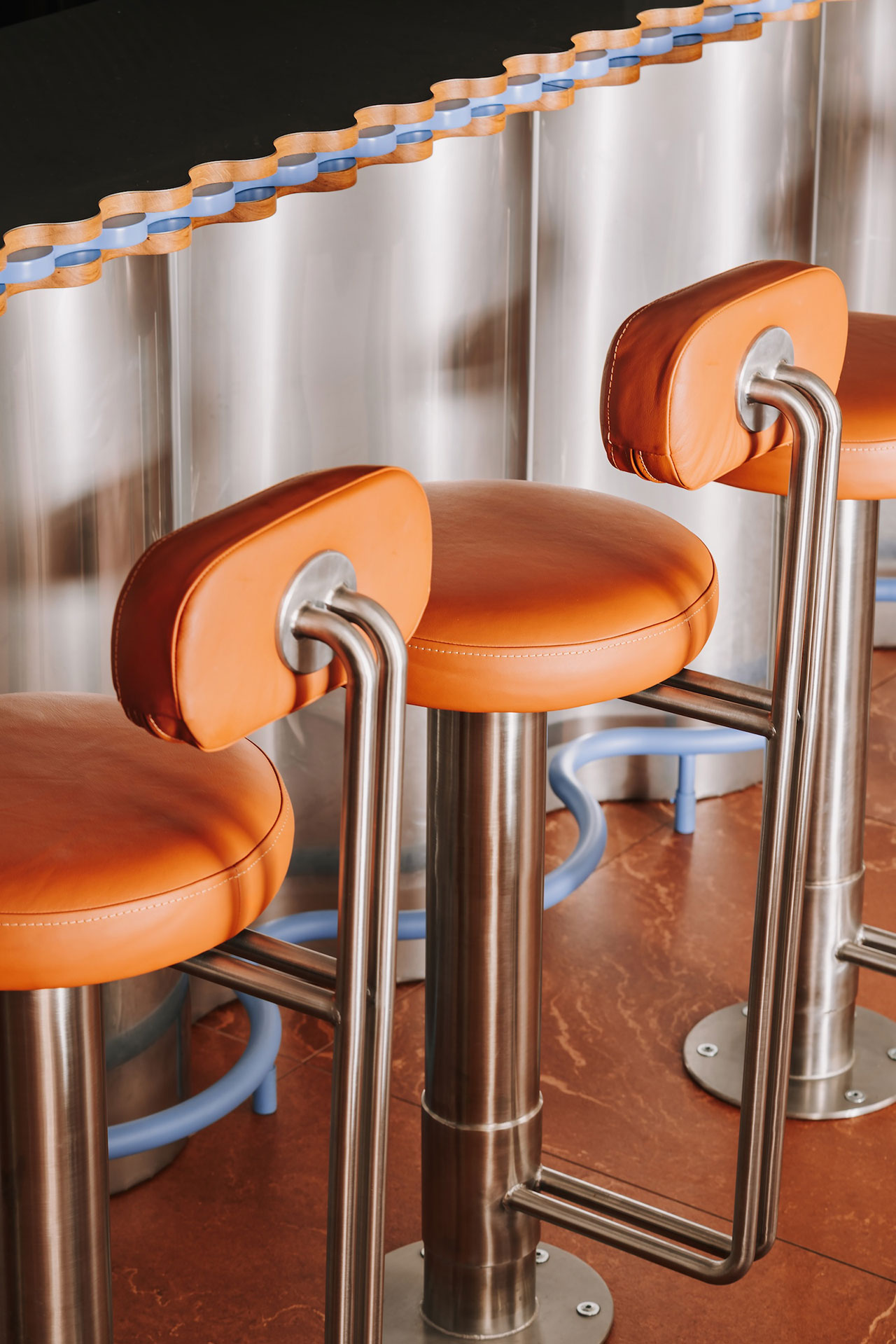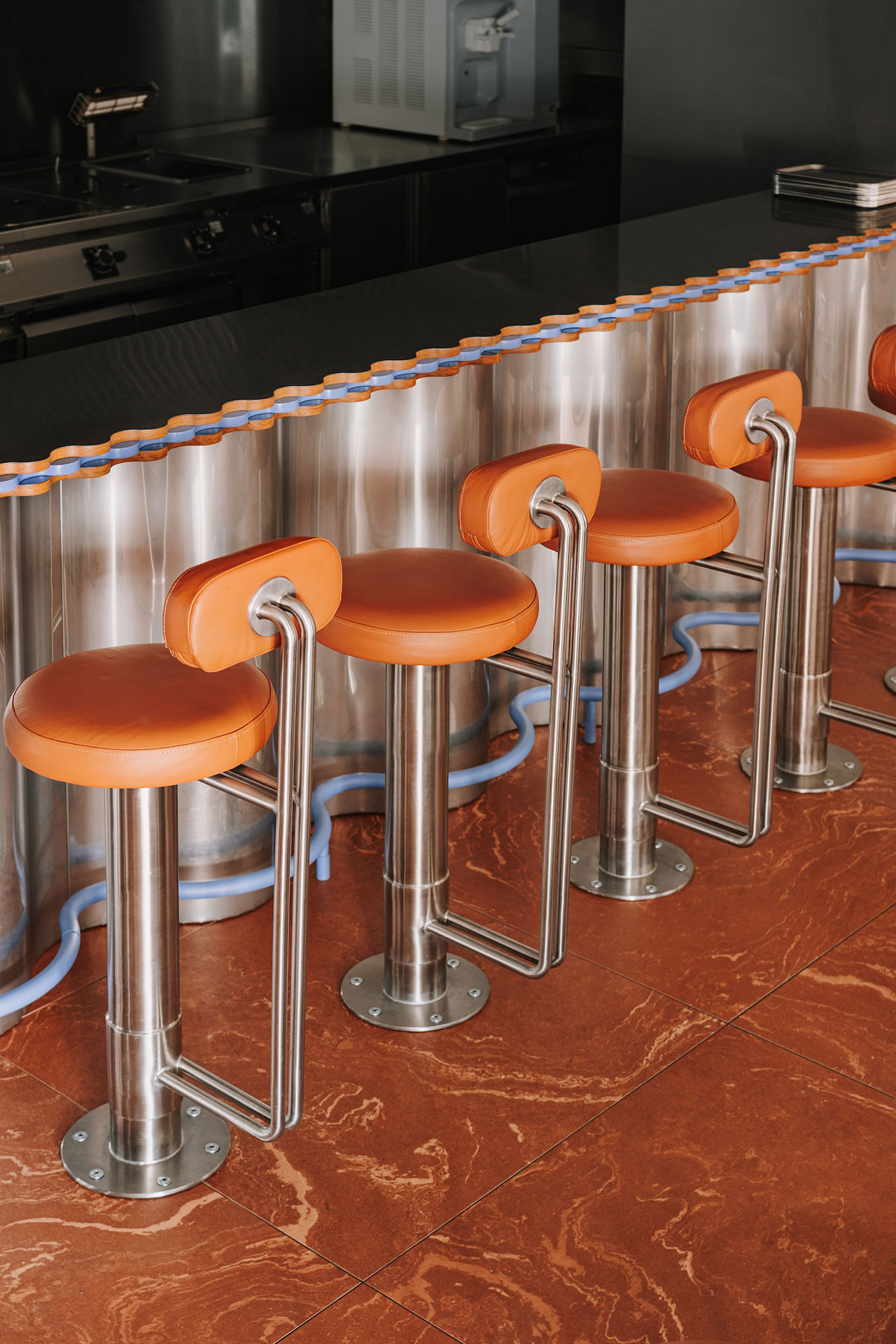 Kožne stolice duž cele linije bara pozivaju goste da prate proces pripreme hrane iz prvog reda. Neonski detalji, toplo svetlo i refleksije u metalu doprinose živoj atmosferi koja je istovremeno nostalgična i potpuno savremena.