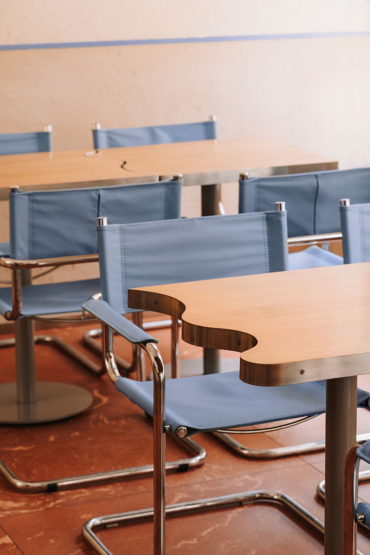 Jedan od ključnih vizuelnih elemenata enterijera je kontinuirana, pulsirajuća linija u plavoj nijansi koja se proteže od bara pa sve do dubine prostora. Ova fluidna forma funkcioniše kao svojevrsna vizuelna esencija koja povezuje sve elemente enterijera.