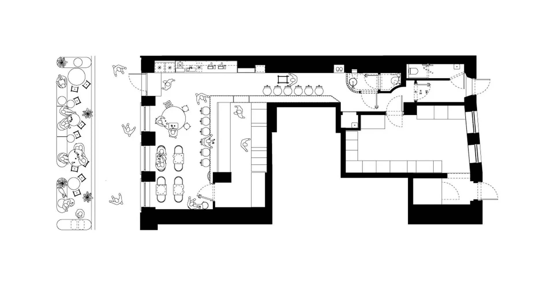 Pluto je zamišljen kao živ, energičan restoran u kojem se priprema hrane odvija na otvorenom i direktno komunicira sa prostorom.