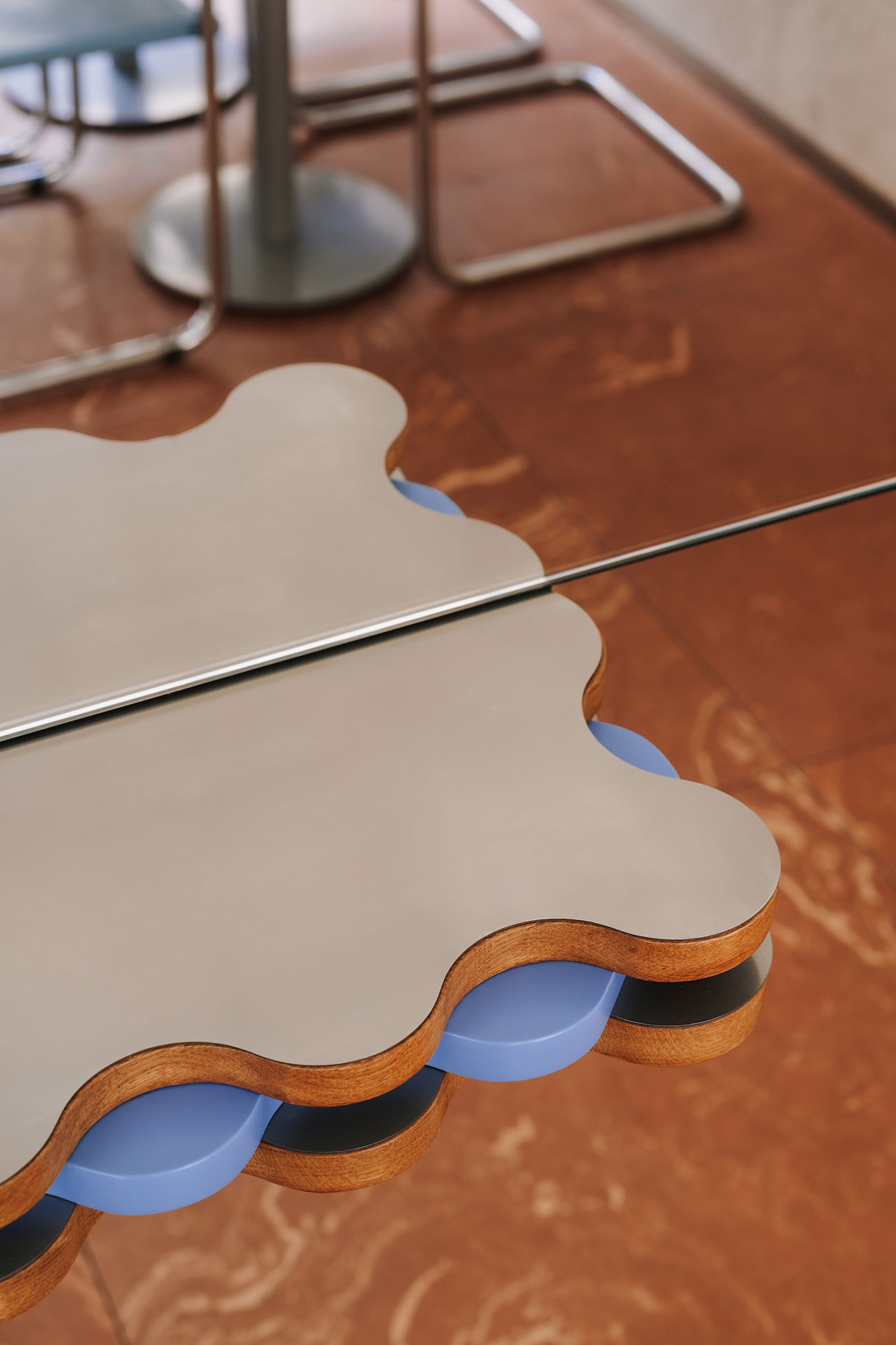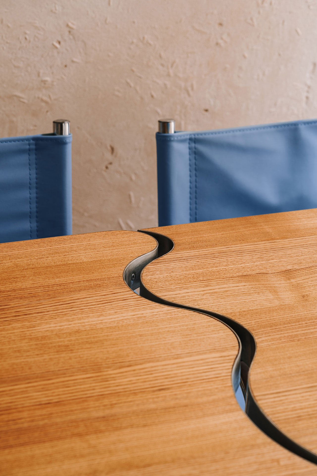 Drvene, talasaste forme dodaju slojevitost i ritam, a kontrastni plavi akcenti uvode smirenost i ravnotežu.