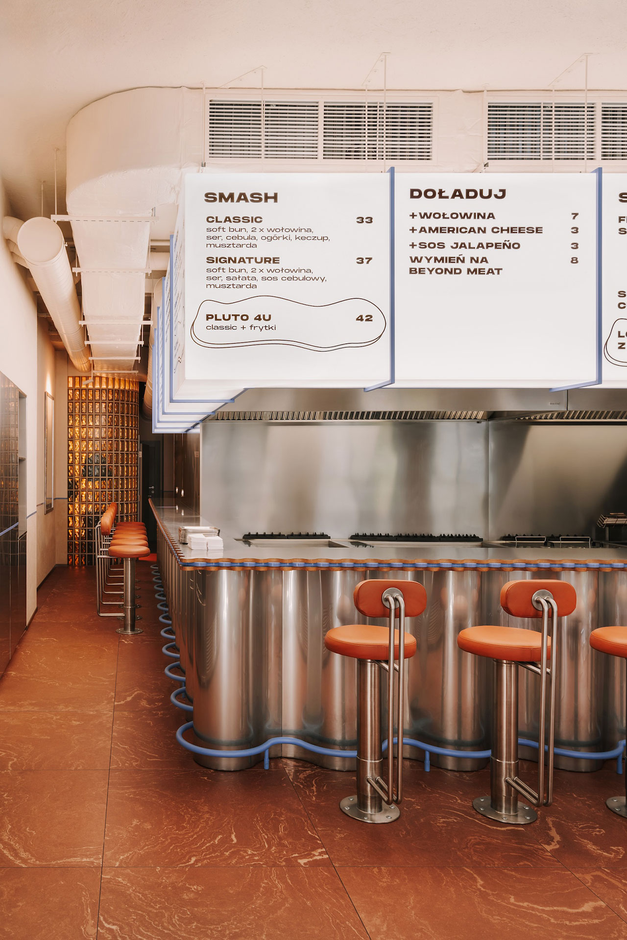 Kao polazište za oblikovanje enterijera poslužila je sama “smash” tehnika pravljenja burgera, u kojoj se povećanjem kontakta mesa sa vrućom površinom pojačava reakcija karamelizacije.