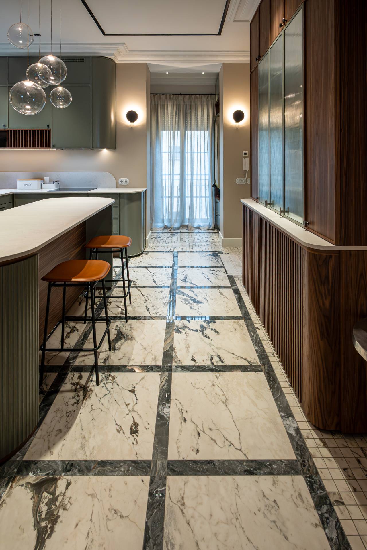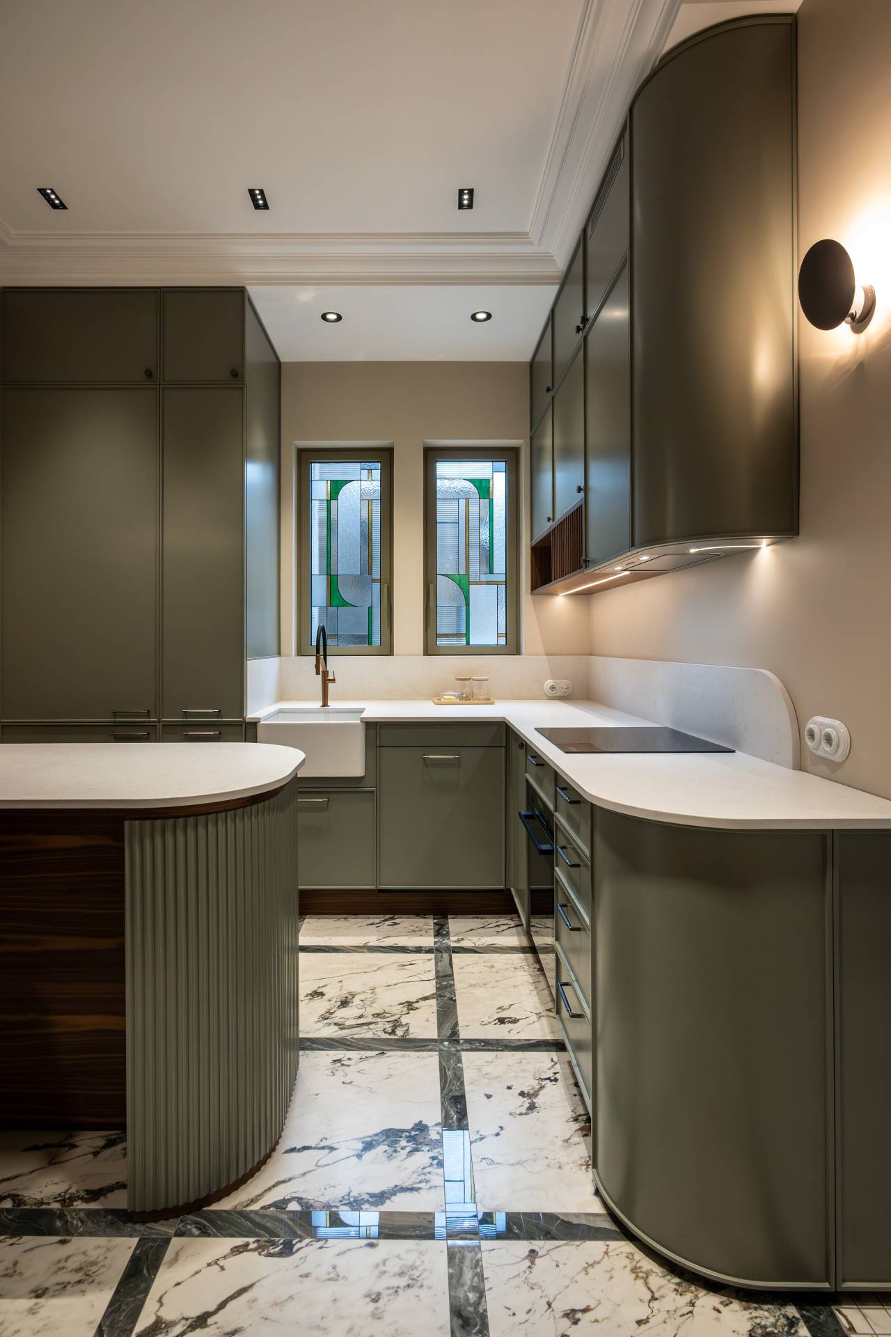 „Vitraž funkcioniše kao suptilan dekorativni akcenat koji filtrira svetlo i povezuje savremeni izraz sa klasičnim nasleđem stana. U kombinaciji sa zaobljenim linijama kuhinjskog ostrva i pažljivo biranom rasvetom, doprinosi mirnoj i sofisticiranoj atmosferi“, ističu autori.