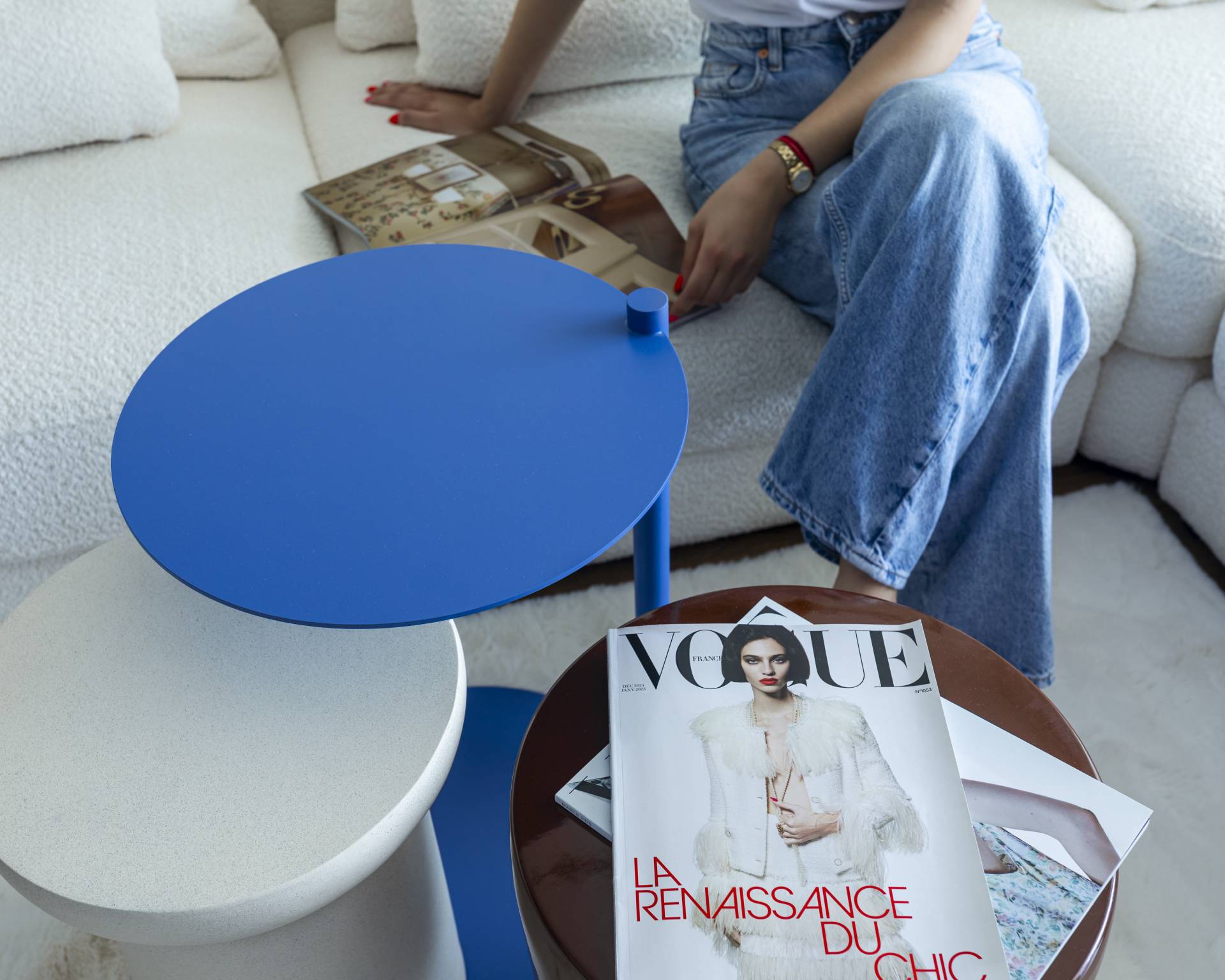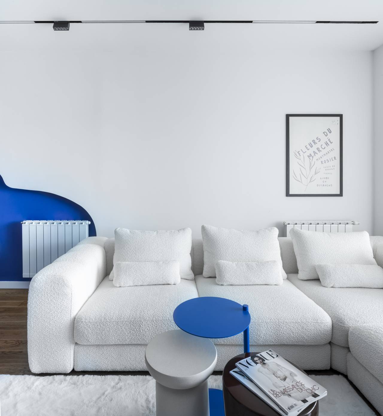 Kolorit balansira između indigo plave, toplih tonova terakote i neutralnih nijansi bele i bež. Drveni pod predstavlja stabilnu, smirenu bazu za snažan vizuelni identitet prostora.
